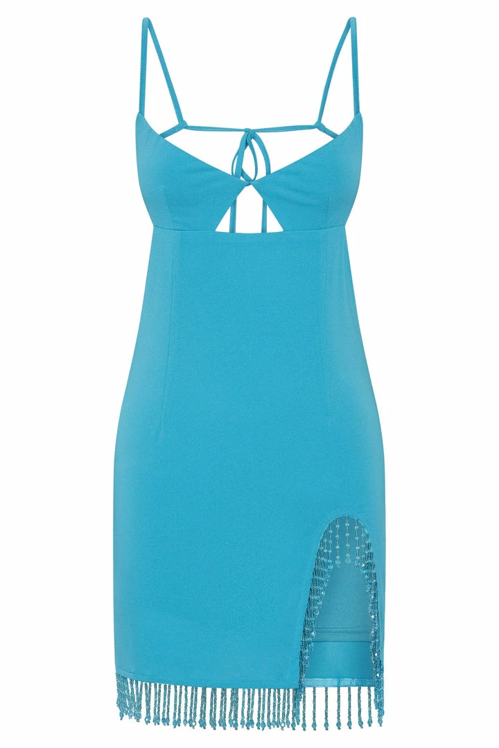 All about the fringe benefits, DARCIE pairs a curve-loving bodycon styling with eye-catching centre cut outs. Crafted from a supportive spandex blend, you’re destined to cut a fine figure in Darcie on your next night out. Match with our Milly Faux Leather Wrap Around Heels to complete the look.