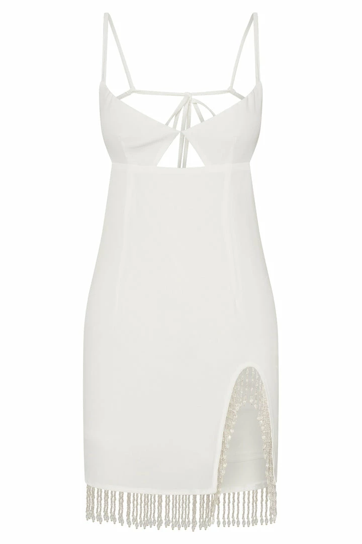 All about the fringe benefits, DARCIE pairs a curve-loving bodycon styling with eye-catching centre cut outs. Crafted from a supportive spandex blend, you’re destined to cut a fine figure in Darcie on your next night out. Match with our Caitlin Diamante Rope Heels to complete the look.