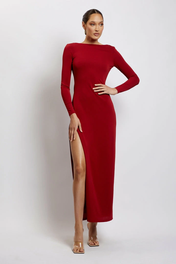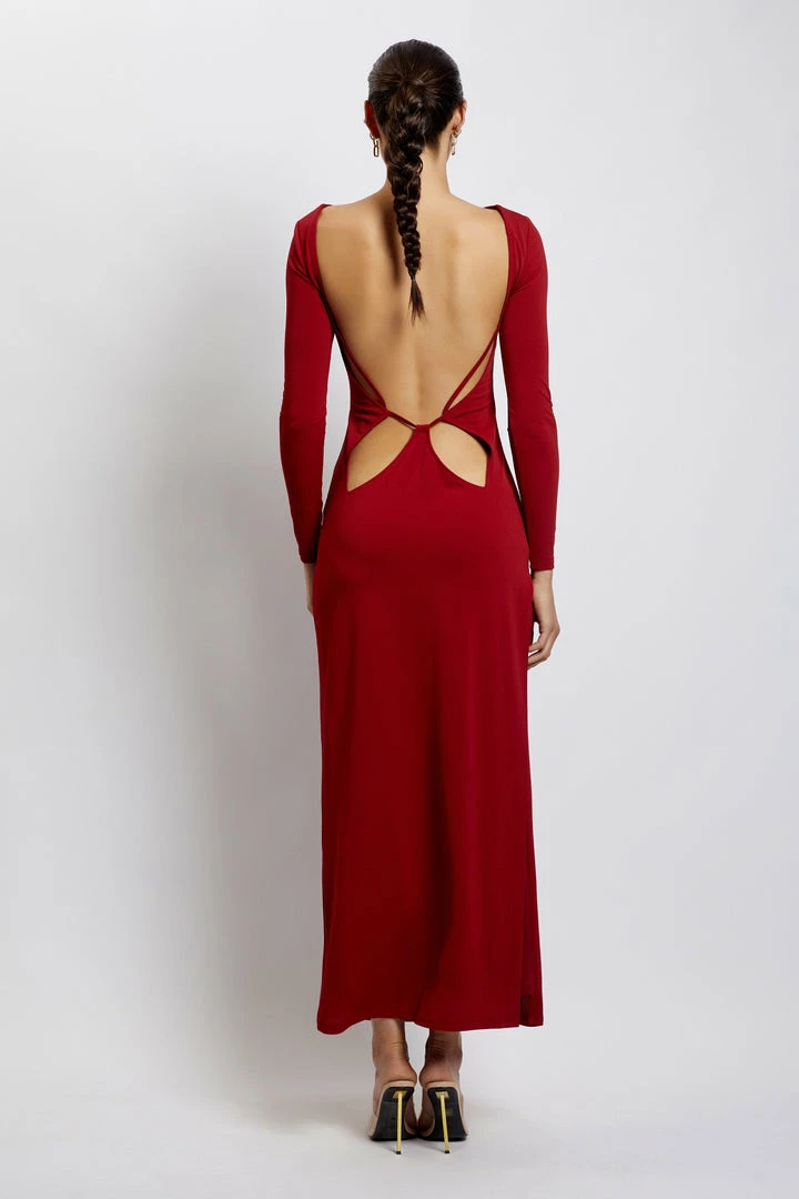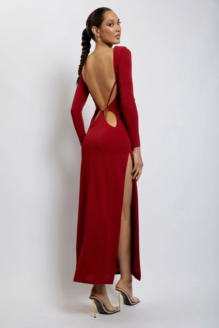 We’re all about unexpected touches of glamour this season. The KEREN Long Sleeve Maxi Dress With Back Cut Outs was made to move in with her thigh-high split, showcasing a daring glimpse of skin for all your party actions. She features a boat neckline and is juxtaposed by an open back with diamond shaped cut-outs at the waist. Complete the look with slicked hair, gold jewels and let your outfit do all the talking.