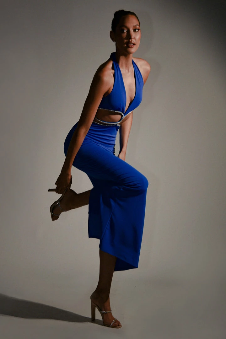 The NICHA Diamante Cut Out Midi Dress is the epitome of evening elegance. Fitted in its form, Nicha features a flattering plunge neckline and architectural waist cut-outs – complete with a finishing touch of diamantes to take your look to the next level. She offers a centre-back split for unrestricted movement and is fully lined for comfort. Complete the look with a sleek bun and minimal accessories for your next glam function.