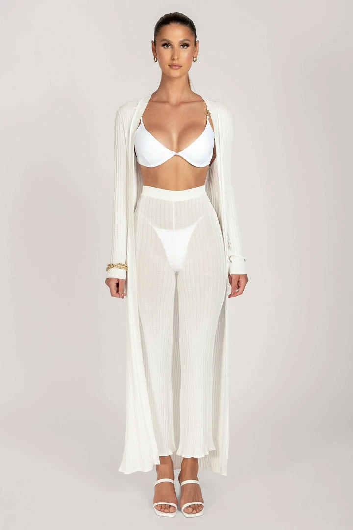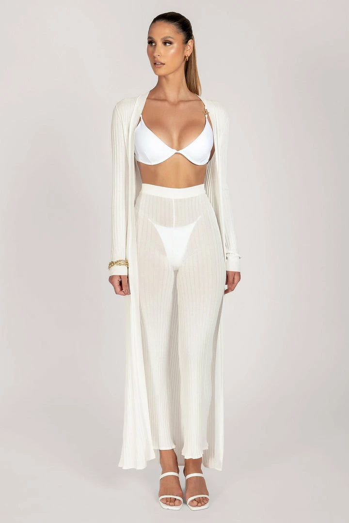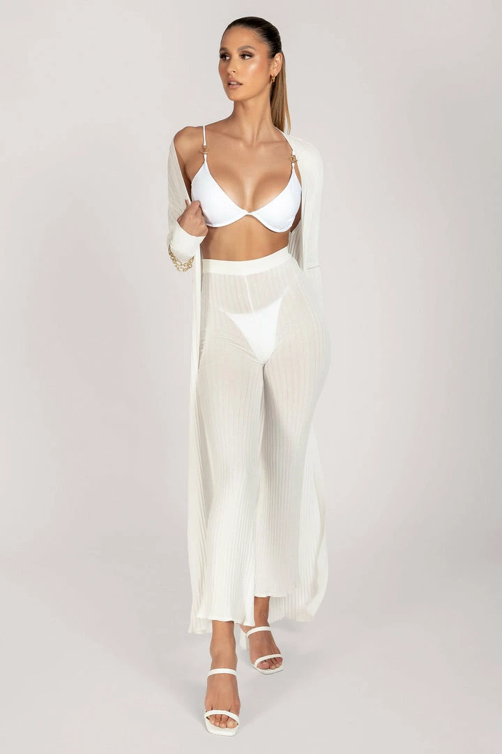 Perfect for your next day out at the beach or poolside vacay, keep your style high in the TIA Ribbed Sheer Knit Wide Leg Trouser. Highlighting your best features these trousers can be perfectly paired with the TIA Ribbed Sheer Knit Maxi Cardigan and TIA Ribbed Sheer Knit Crew Neck Top.