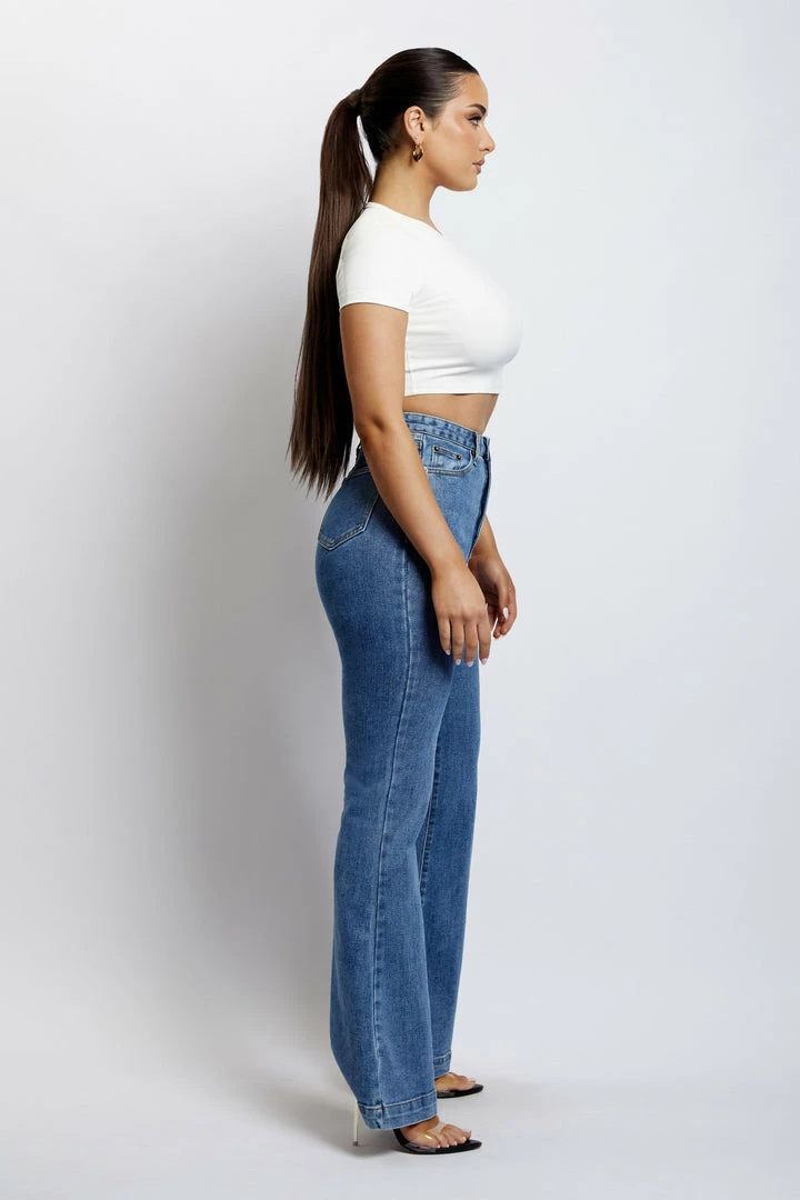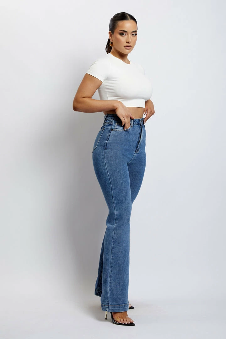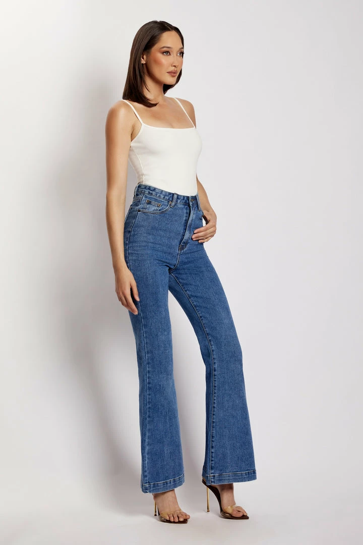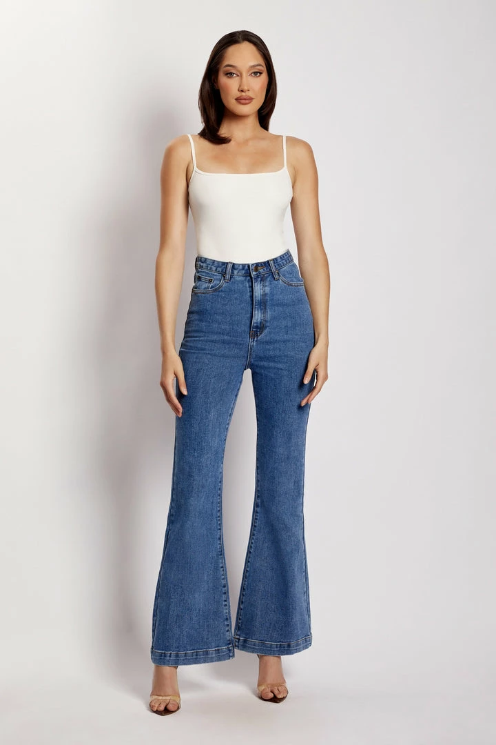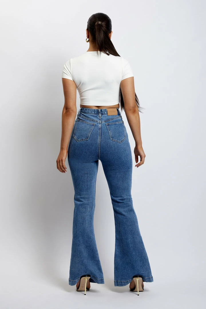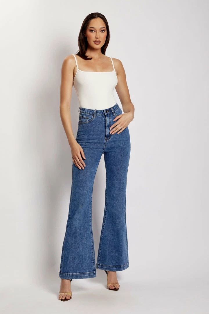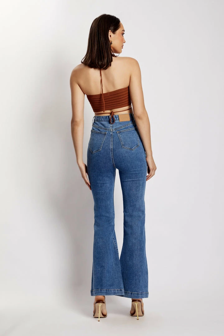 Make your denim debut in the EBONY Flare Full Length Jean. A nod to 70’s inspired fashion, Ebony is a contemporary update for the MESHKI girl that loves to make a subtle statement. She sits comfortably at the waist and features functional hip and back pockets. Take it to the next level by pairing with our Mollie Satin Ruched Halter Top or keep it casual with our Basic Tops or Basic Bodysuits.