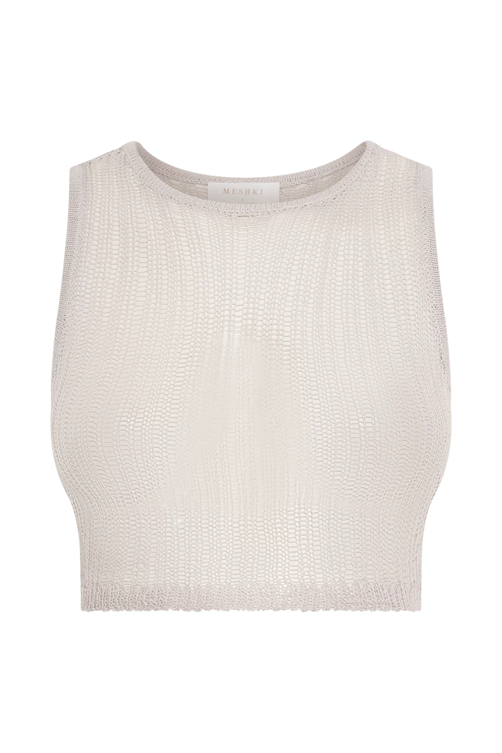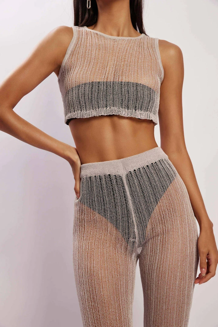 Invite an effortless edge to your ensemble in MANDY. Cut from a sheer knit fabrication, Mandy features a high neckline, sleeveless design and cropped fit. Complete your look with our Mandy Knit Flare Trousers for maximum impact.