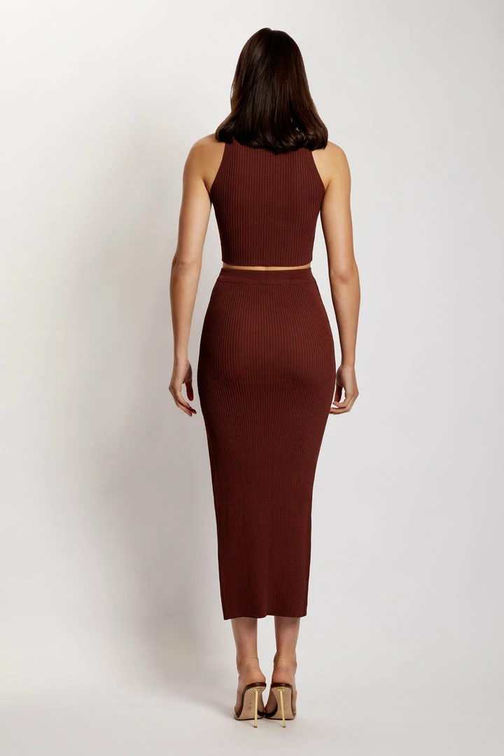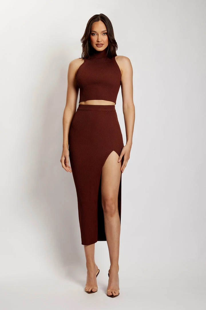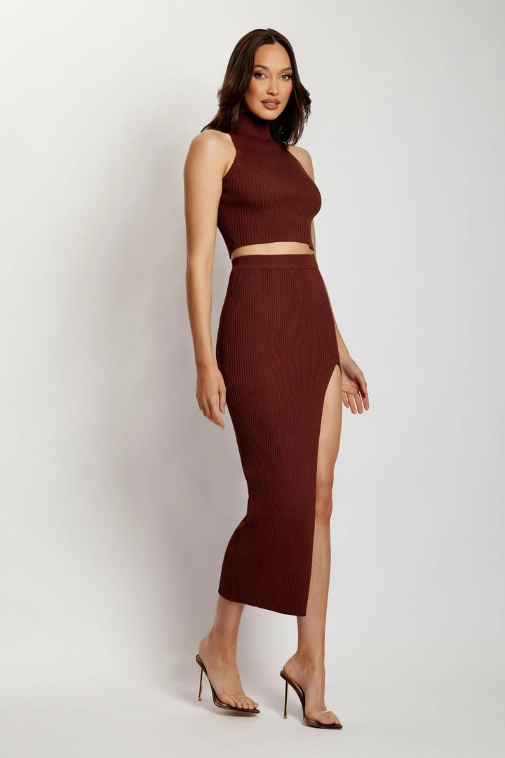 Embrace your curves and welcome the MELANIE Knit High Split Midi Skirt to your forever wardrobe. Cut from a fully fashioned ribbed knit, Melanie will hug your body in all the right areas. We love the side split allowing unrestricted movement and the perfect hint of skin. She pairs seamlessly with our Sandra High Neck Fully Fashioned Top and gold accessories.