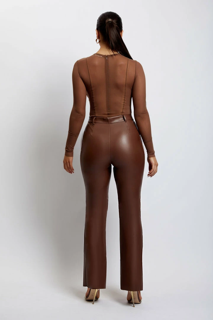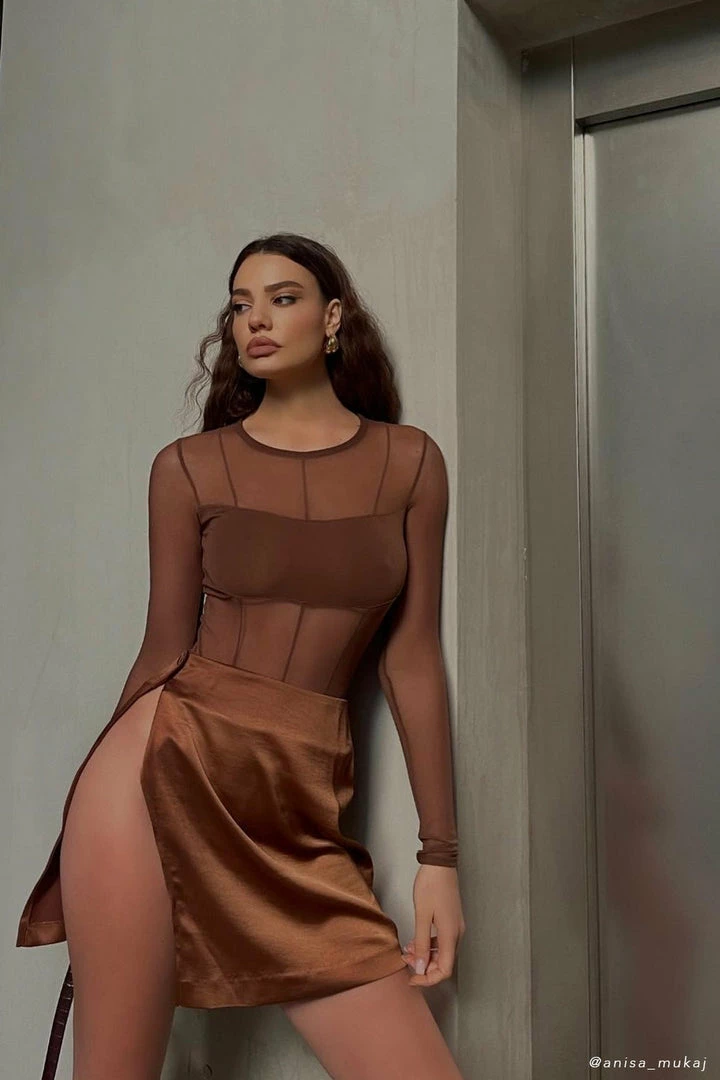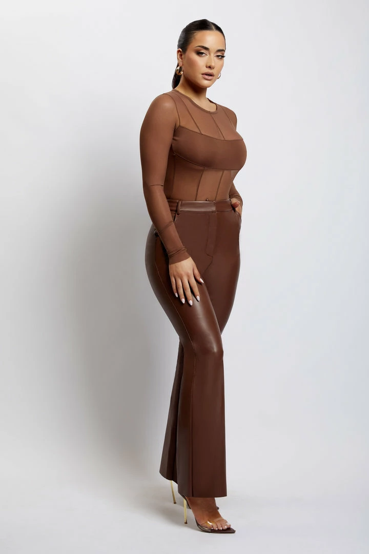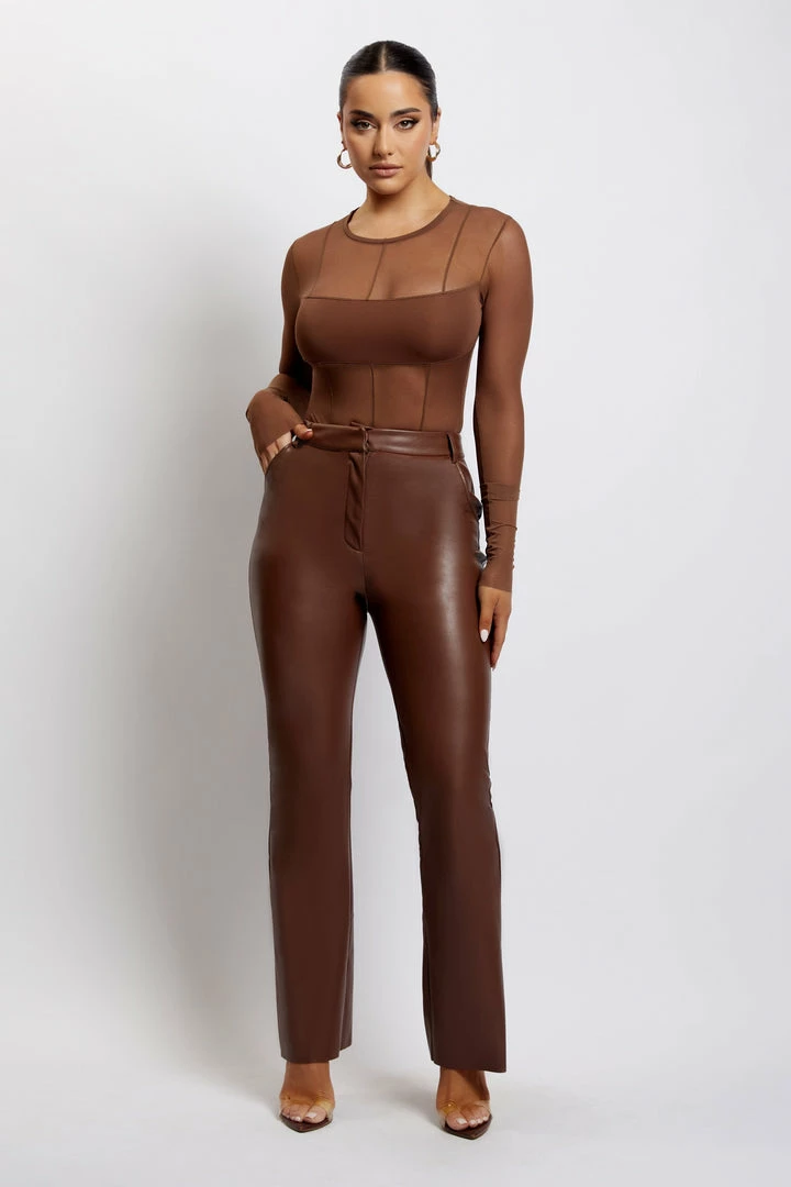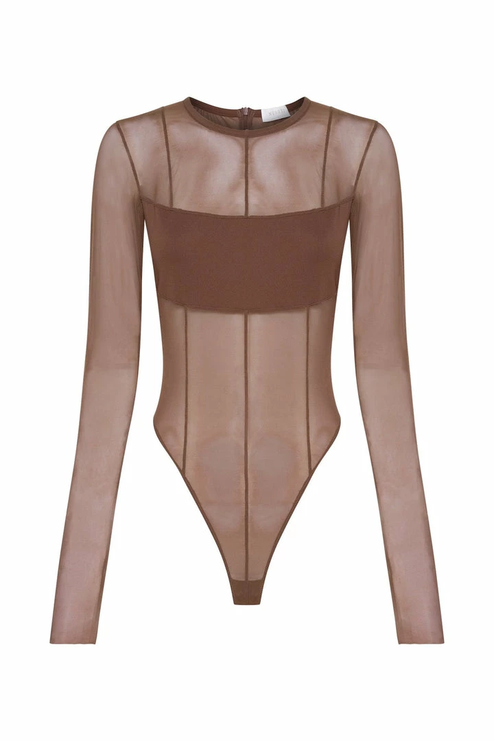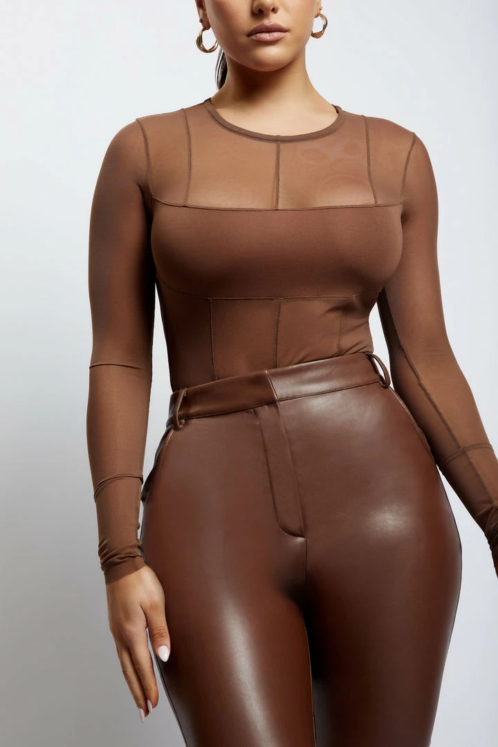 Step into the spotlight in TARNA Long Sleeve Mesh Bodysuit. The pin stitching detail perfectly has been designed to accentuate your waist while the sheer mesh contrasted with the jersey panel on the bust adds a touch of drama. Complete with MESHKI Denim for daytime events on the horizon or our Romi Asymmetric Wrap Satin Mini Skirt for a luxe evening look.