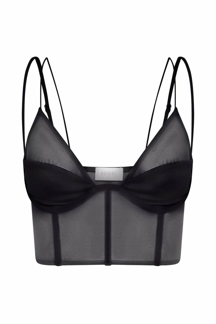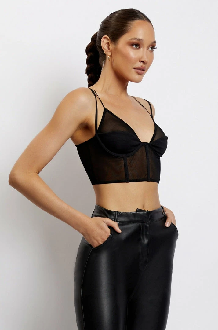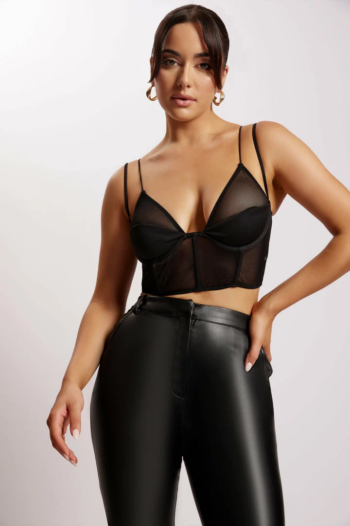 Add a little edge to your event wardrobe with the ANGELIQUE Demi Cup Mesh Bustier. Cut from our luxurious mesh fabrication in a cropped design, Angelique features corsetry boning and ultra skinny straps to show off your décolletage. Complete your look with our Tyra Straight Leg Faux Leather Pants for the ultimate after-dark attire.