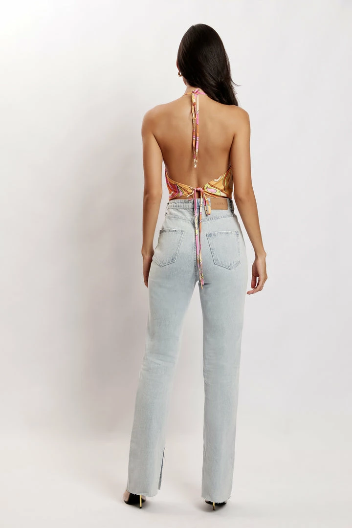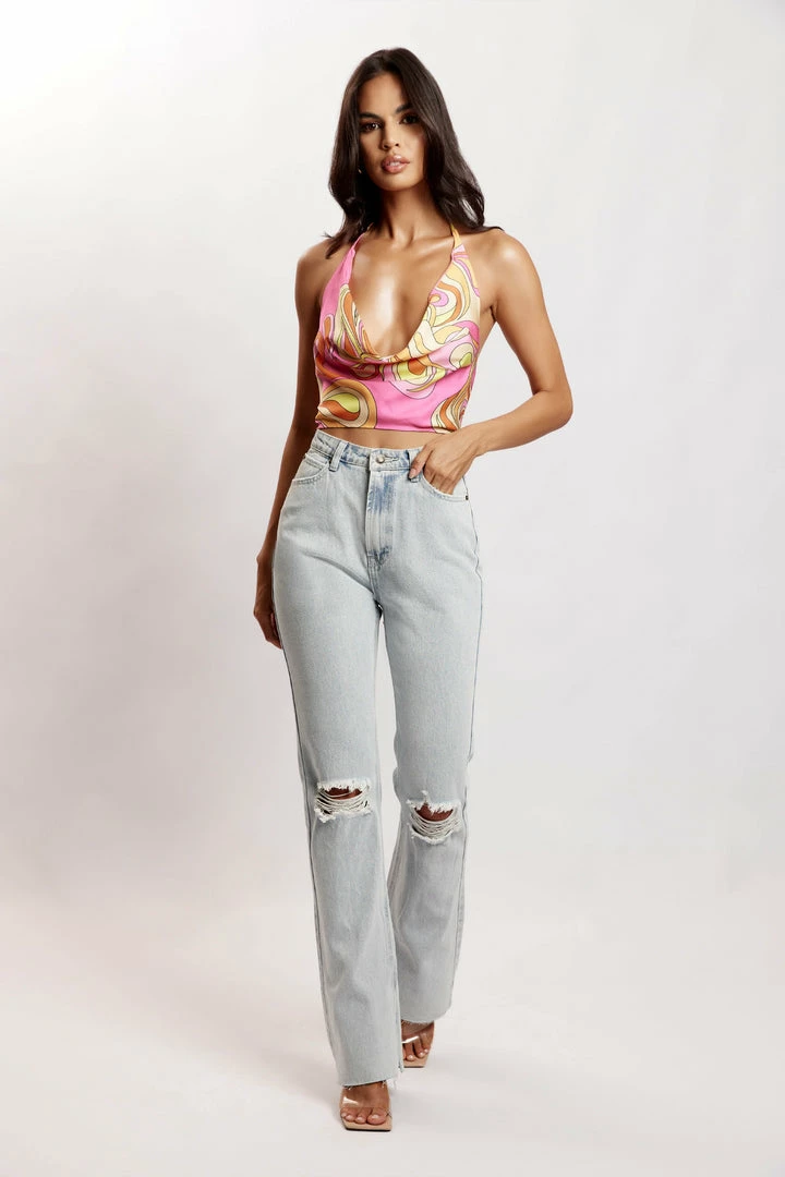 Meet AMY. She strikes the perfect balance between sultry and sophisticated and makes an impression from all angles. Cut from a luxurious satin fabrication, Amy boasts a halter cowl neckline, open back to compliment your sun-kissed glow and is cropped in length. Complete your look with our Lauren Straight Leg Ripped Jeans and gold jewellery for the ultimate after-dark allure.