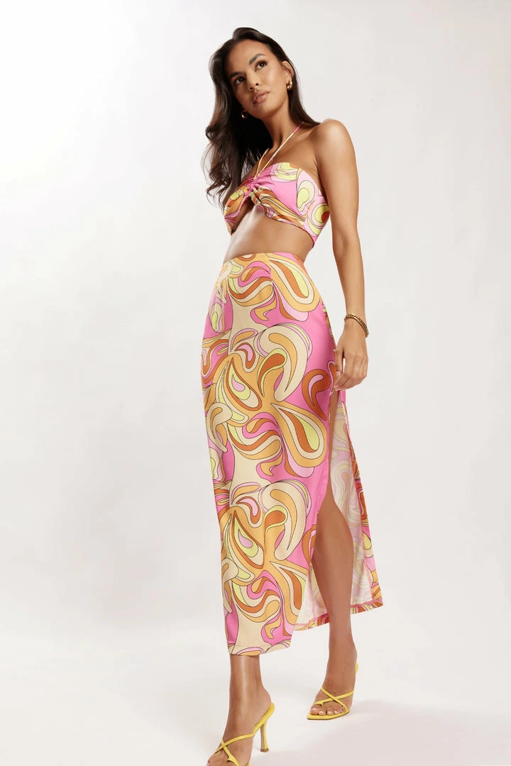 A chic update to your classic bandeau, FRANKIE is a gorgeous play on statement dressing. Showcasing a sweetheart neckline, she is suspended by skinny halter straps and features delicate centre front ruching. Cropped in design, Frankie is cut from a lightweight satin fabrication in our exclusive psychedelic print. Style with our matching Frankie Two Tone Satin Maxi Skirt or dress her down with MESHKI Denim.