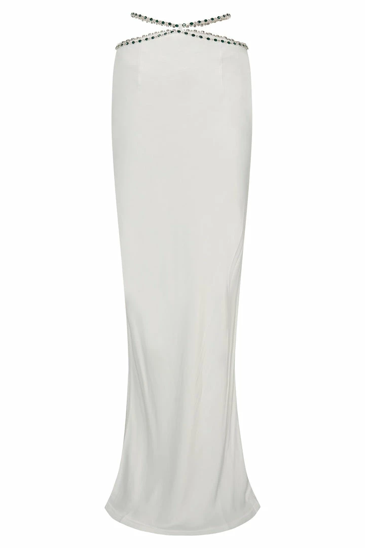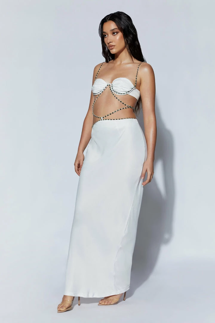 Like an exotic dancer dripping in gems, ropes, and jewel-toned fabrics, channel an air of effortlessly grace in the HAVVA Diamante Trim Maxi Skirt. Made of soft, natural material that bends and flows with your movements, this skirt creates a mesmerising, naturally elegant silhouette. The considerable length of the skirt adds a slight, subtle hint of mystery that pairs well with the piece’s quiet, neutral colours: pure white and solid black. A low-rise waistline accentuates the lovely jut of your hips, the soft curves of your waist, the gradual dips and rises of your figures. And Havva’s dazzling diamante trim further highlights it! Trust me; you’ll feel stunning, glamorous, and oh-so sexy with the bejewelled ropes criss-crossing your abdomen. Let these glitzy strings shine by pairing with our Havva Diamante Top, then finish off this exotic look with artfully tousled hair, smoked-out eyeliner, and simple jewellery in gold or silver.