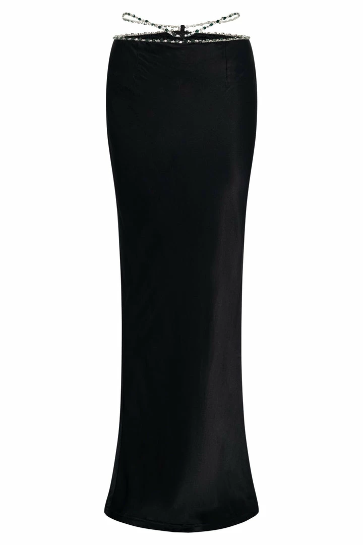 Like an exotic dancer dripping in gems, ropes, and jewel-toned fabrics, channel an air of effortlessly grace in the HAVVA Diamante Trim Maxi Skirt. Made of soft, natural material that bends and flows with your movements, this skirt creates a mesmerising, naturally elegant silhouette. The considerable length of the skirt adds a slight, subtle hint of mystery that pairs well with the piece’s quiet, neutral colours: pure white and solid black. A low-rise waistline accentuates the lovely jut of your hips, the soft curves of your waist, the gradual dips and rises of your figures. And Havva’s dazzling diamante trim further highlights it! Trust me; you’ll feel stunning, glamorous, and oh-so sexy with the bejewelled ropes criss-crossing your abdomen. Let these glitzy strings shine by pairing with our Havva Diamante Top, then finish off this exotic look with artfully tousled hair, smoked-out eyeliner, and simple jewellery in gold or silver.