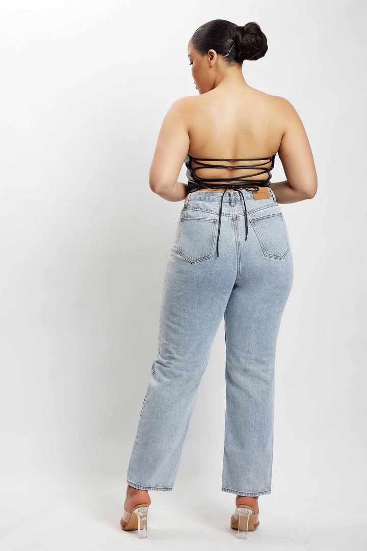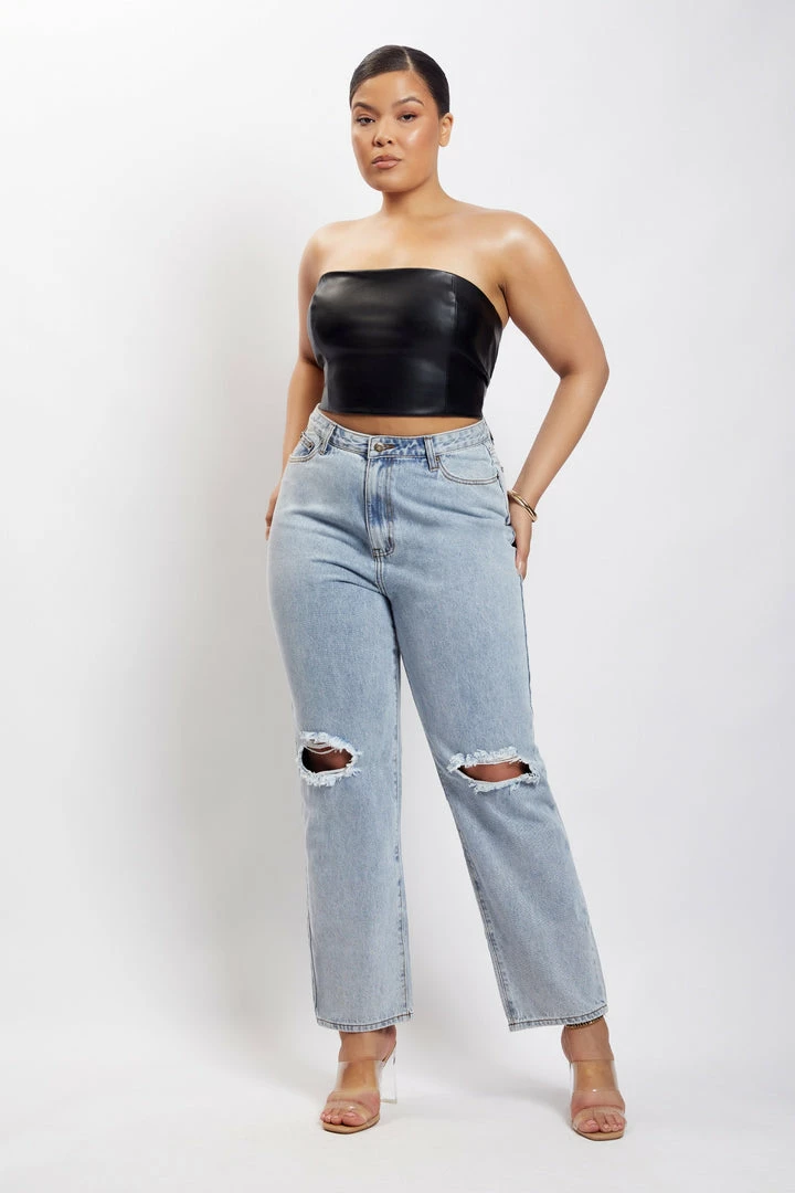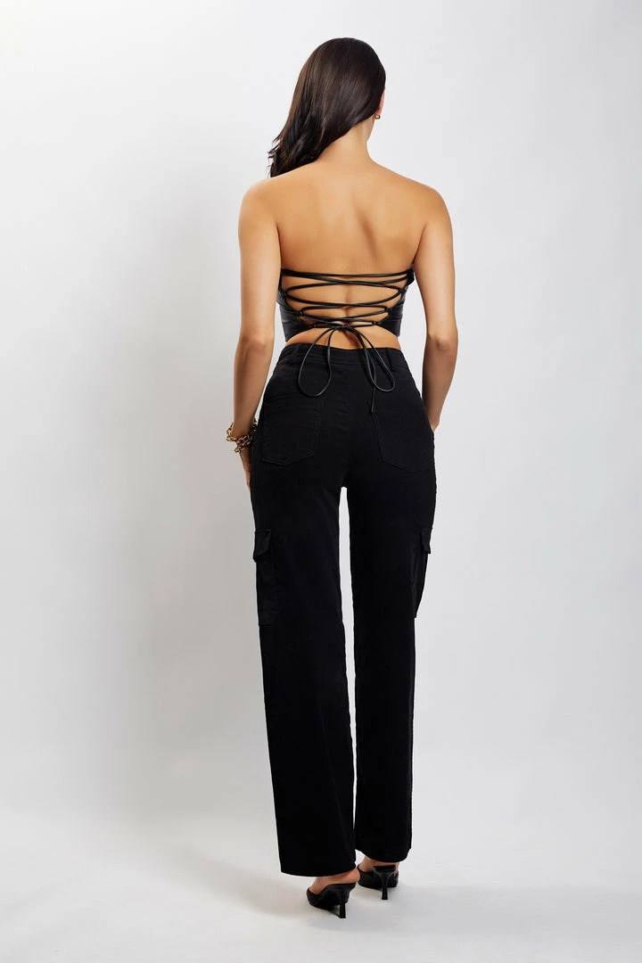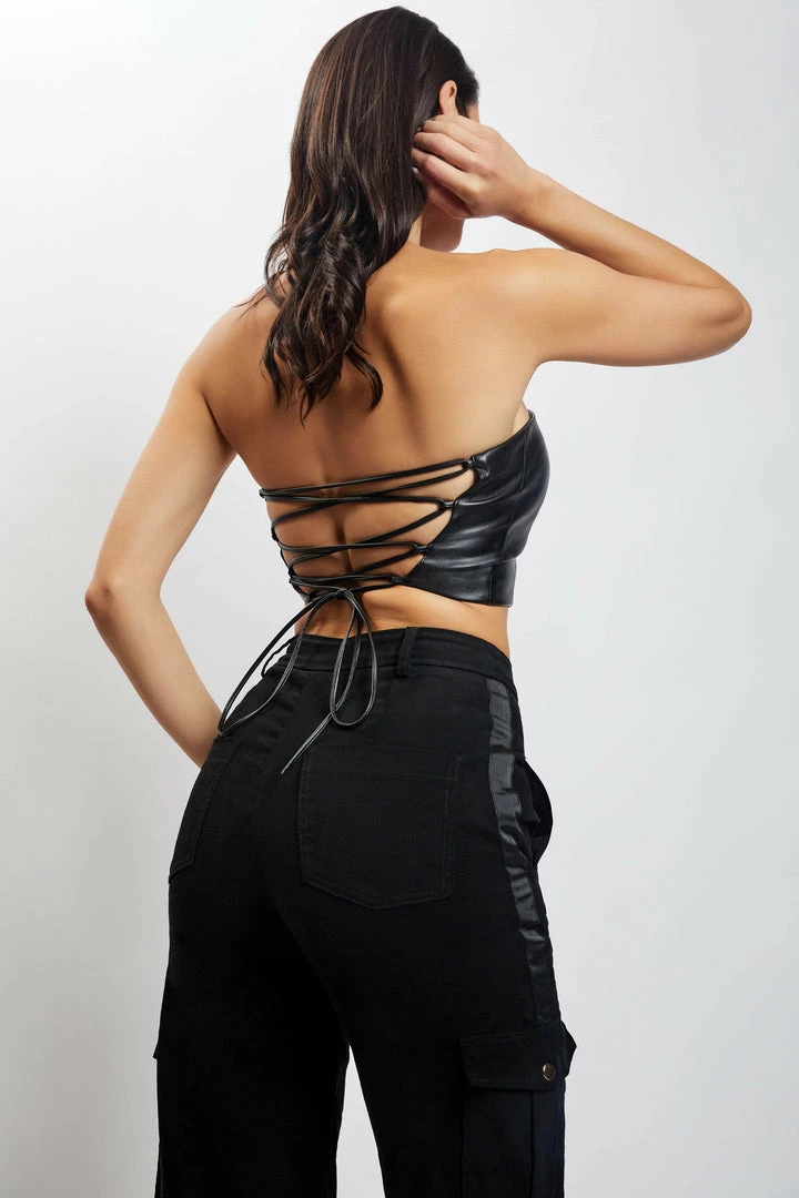 A faux leather strapless design boasts infinity versatility. The PAMELA Lace Up Back Top will seamlessly incorporate into your event wardrobe – designed to be mixed and matched to rise to the occasion. Minimal in design, Pamela will elevate your ensemble with her lace-up back detailing. Pair with our co-ordinating Tyra Straight Leg Faux Leather Pants or MESHKI Denim.