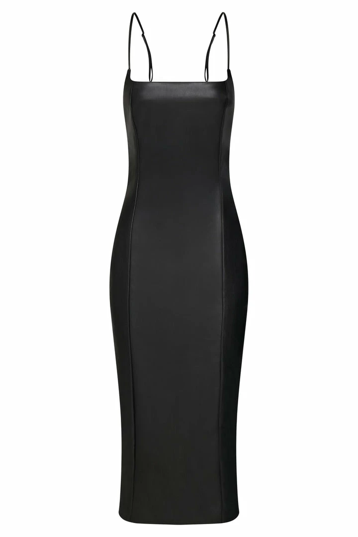 Crafted from a premium faux leather fabrication, the CELINE Faux Leather Square Neck Midi Dress is a look that will guarantee double takes. Celine boasts a bodycon silhouette that flatters the form, a striking open back with elastic detailing and skinny adjustable straps for a personalised fit. For a sexy and on-trend impression, complete the look with mules or barely-there stilettos.