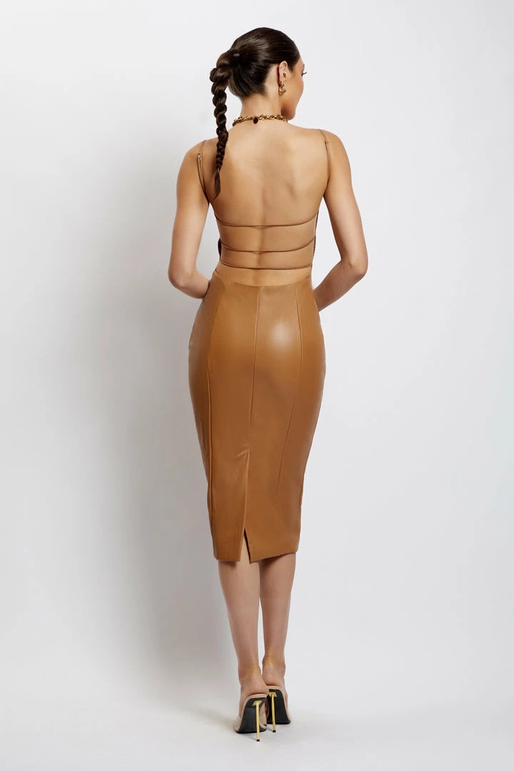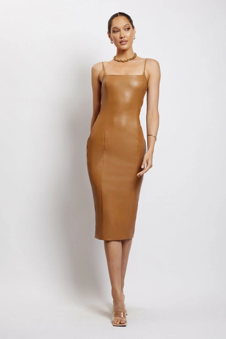 Crafted from a premium faux leather fabrication, the CELINE Faux Leather Square Neck Midi Dress is a look that will guarantee double takes. Celine boasts a bodycon silhouette that flatters the form, a striking open back with elastic detailing and skinny adjustable straps for a personalised fit. For a sexy and on-trend impression, complete the look with mules or barely-there stilettos.