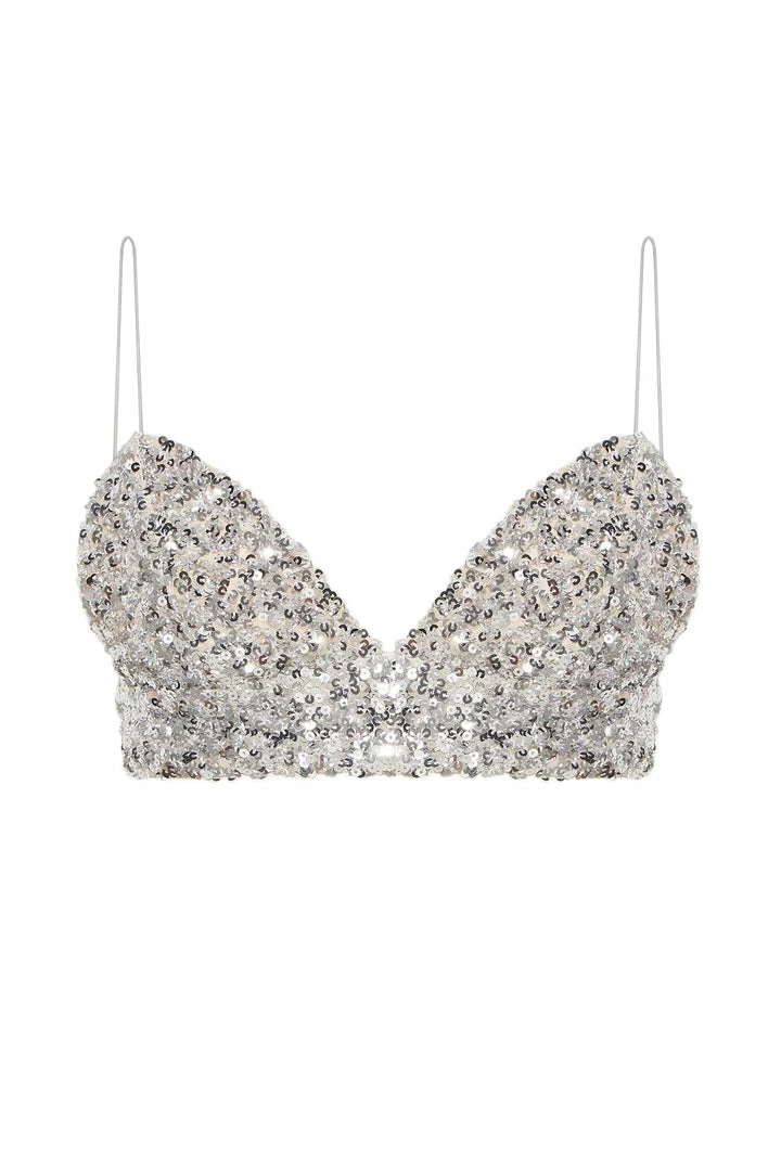 Alluring and chic, the BLAIR Full Sequin Triangle Top will be your go-to for a night out or that next party. Designed with silver sequins, stretchy mesh lining and hook and eye to close, this is an instant luxe update to your wardrobe. Pair with matching BLAIR Pants for a show-stopping look.