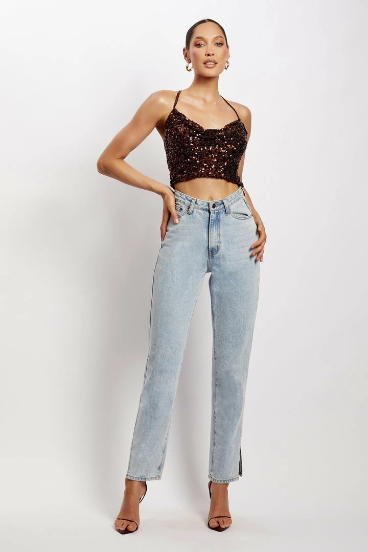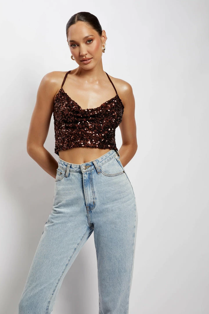 Statement sequins and an alluring silhouette come together in the NIKITA Sequin Cowl Neck Top. This eye-catching piece features a cowl neckline, adjustable cross-back shoulder straps and a sexy bare back design. Cropped in design, Nikita pairs seamlessly with our Ebony Flare Full Length Jean and strappy heels.