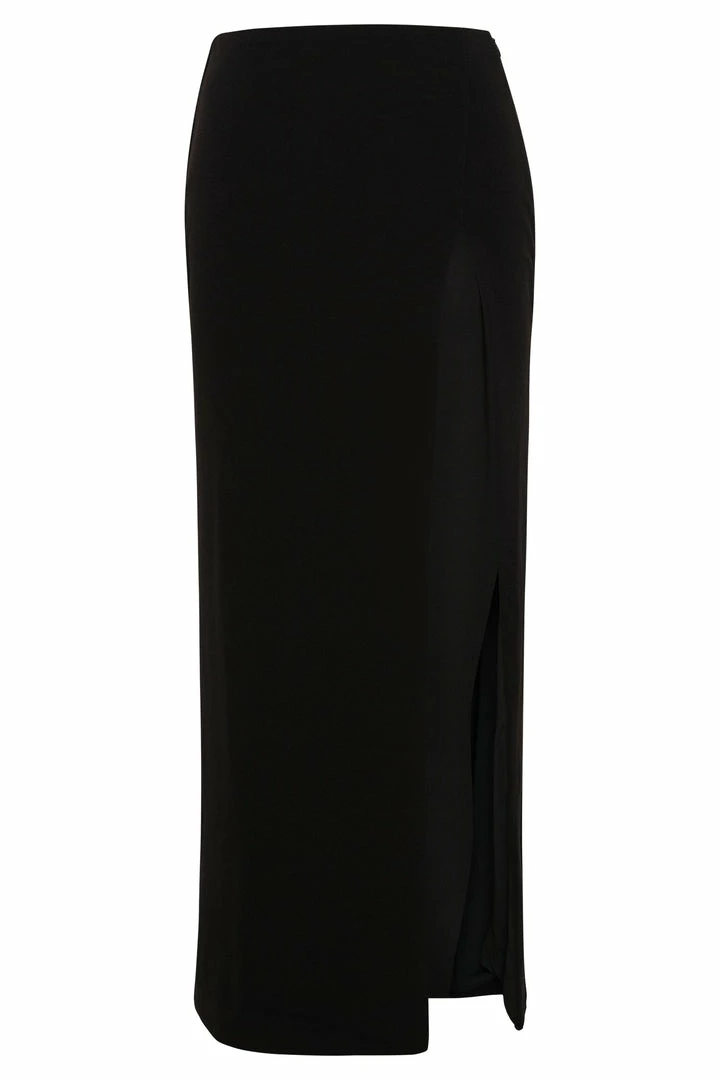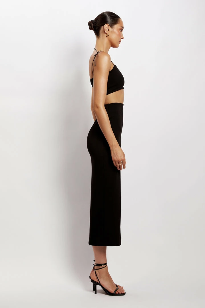The subtle, sensual appeal of a thigh slit is amplified in longer, lengthier skirt lengths — which is why we decided that ARLA would be an ankle-sweeping Maxi Skirt. Her thigh-high slit is like art in motion, cycling through a conceal-then-reveal loop as you walk. Pulled back, the leg is covered by soft, figure-hugging material. But then you step forward and it’s on full display. This is sure to turn a few heads, as the playful ‘now you see it, now you don’t!’ concept comes off as teasing and flirty in a way that’s neither too revealing nor too covered. A barely-noticeable side zipper makes it easy to slip this skirt on and off as needed. Side lining and lined edges add an extra layer of soft, subtle details to the skirt’s silhouette. The thigh slit itself turns this Maxi Skirt from a closet basic to a wardrobe must-have. Semi-formal lunch at a respectable restaurant? Business casual meeting? Bar-hopping with friends? When paired with our Arla Hardware Bralette, Neve Wrap Around Faux Leather Heels and gold jewellery, Arla is perfect for literally any occasion!
