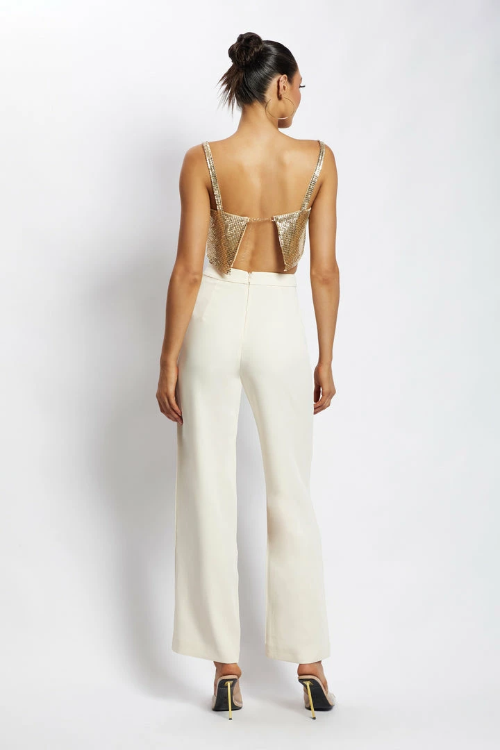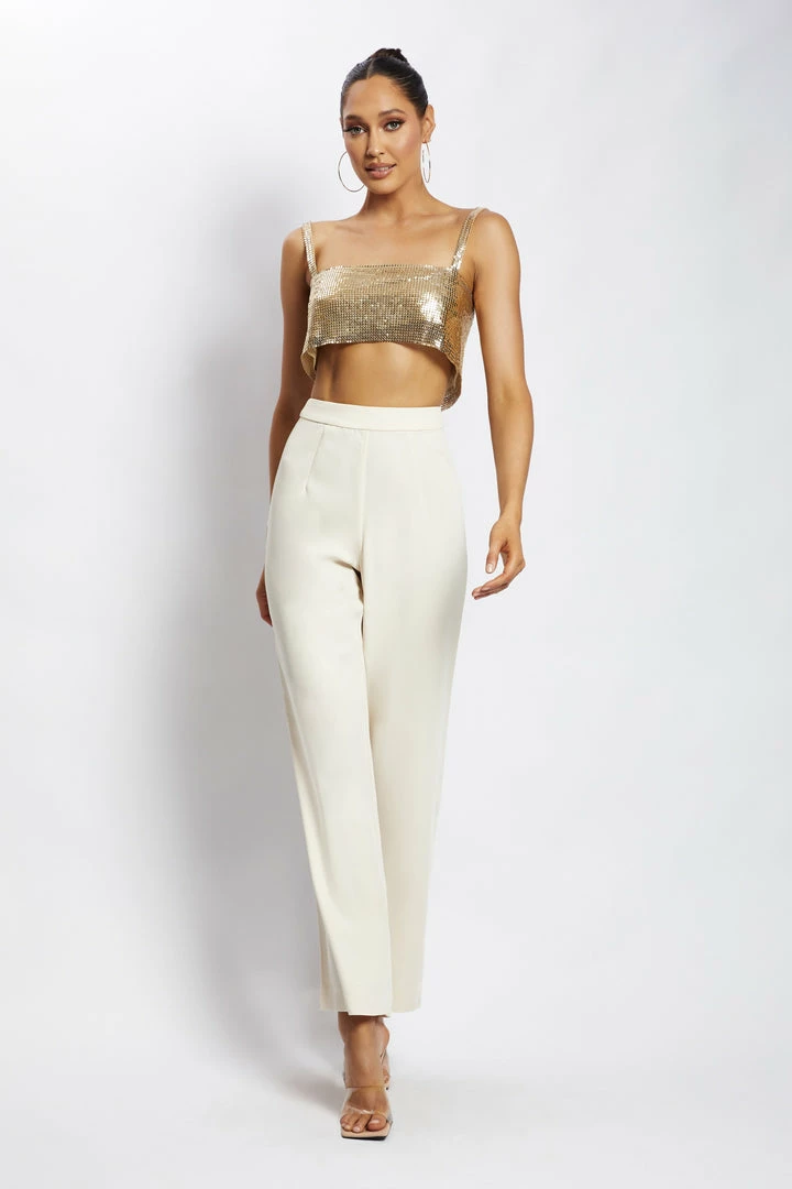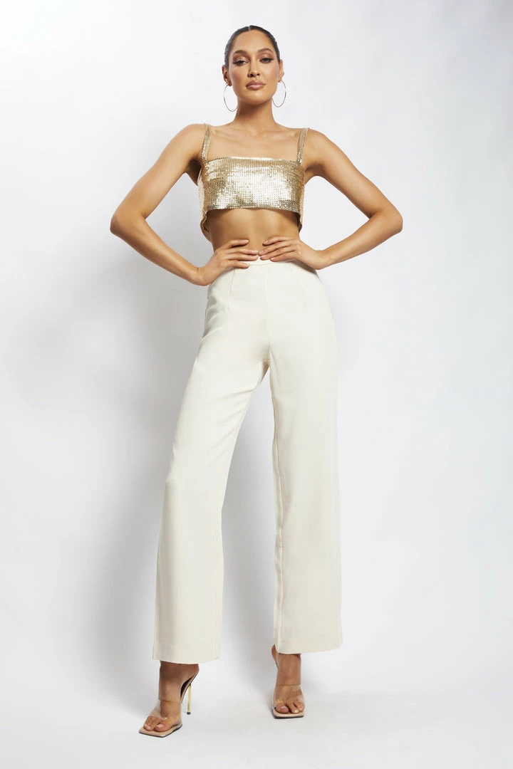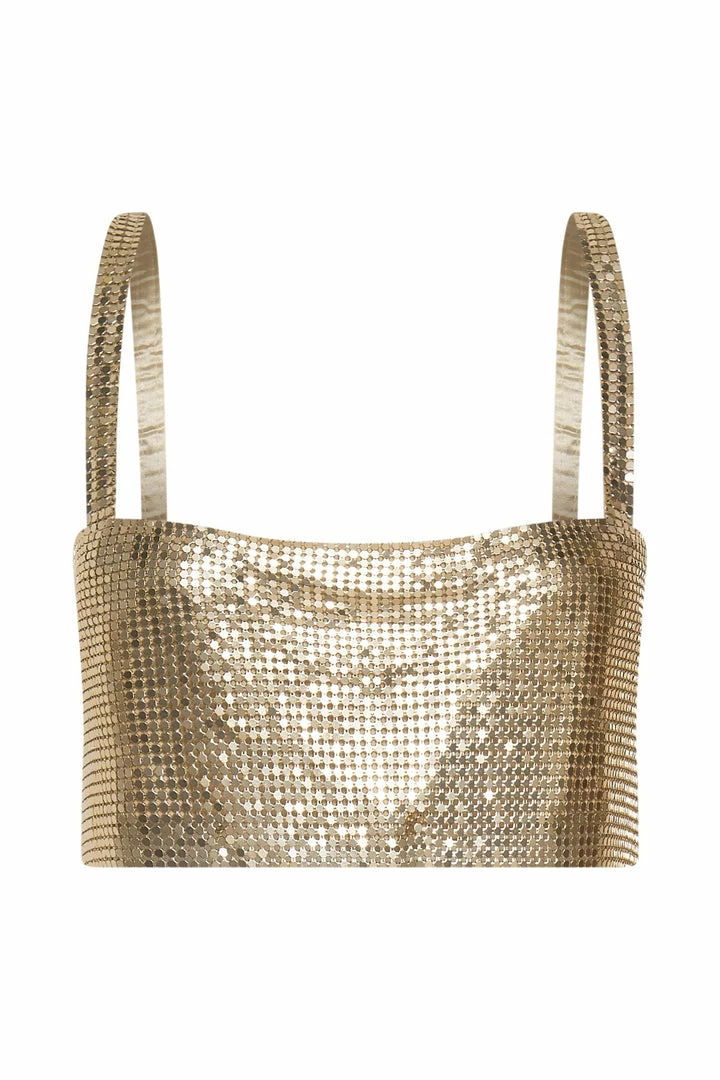 Go for bold in LIANNE. Handcrafted from our signature rhinestone and aluminium fabrication, this statement bandeau features wide shoulder straps, a square neckline and striking open back with a subtle chain fastening. Complete the look with neutral bottoms like our Saskia Straight Leg Trousers and let Lianne be the main attraction.