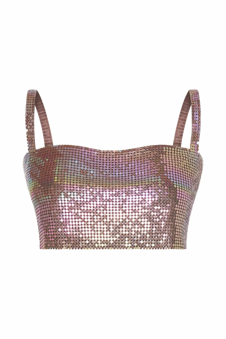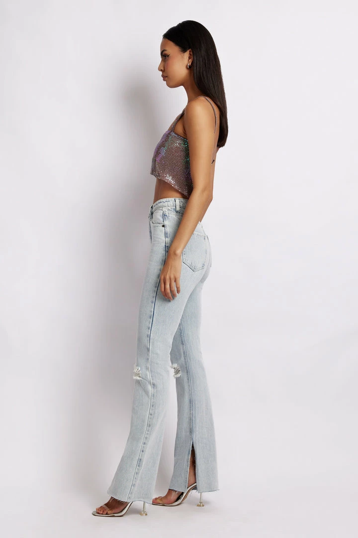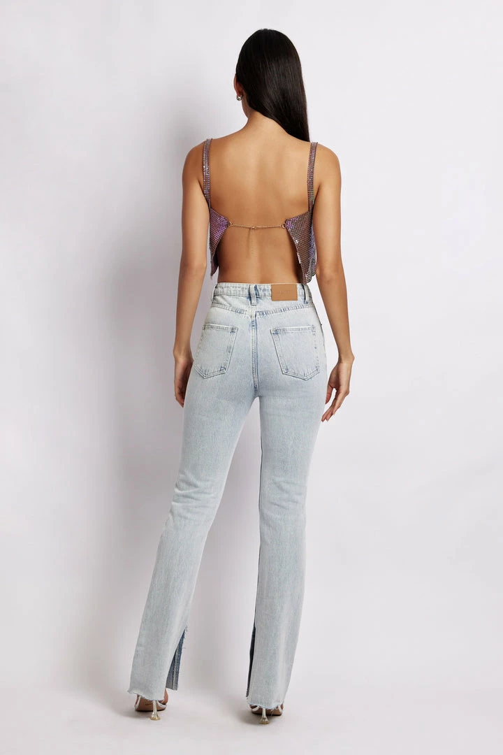 Go for bold in LIANNE. Handcrafted from our signature rhinestone and aluminium fabrication, this statement bandeau features wide shoulder straps, a square neckline and striking open back with a subtle chain fastening. Complete the look with neutral bottoms like our Lauren Straight Leg Ripped Jeans and let Lianne be the main attraction.