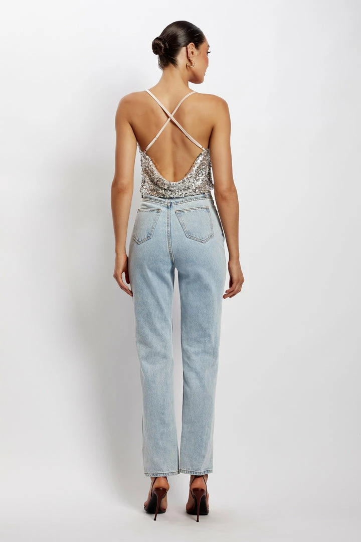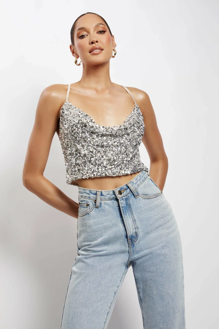 Statement sequins and an alluring silhouette come together in the NIKITA Sequin Cowl Neck Top. This eye-catching piece features a cowl neckline, adjustable cross-back shoulder straps and a sexy bare back design. Cropped in design, Nikita pairs seamlessly with our Ebony Flare Full Length Jean and strappy heels.