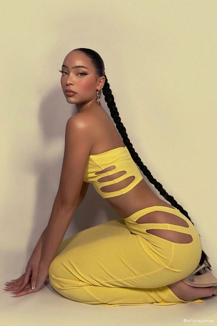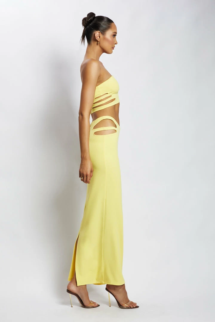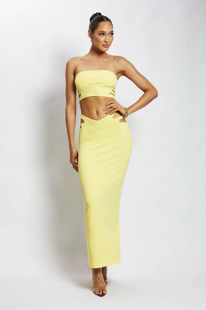 Designed to flatter the form from all angles, the AUDRINA Cut Out Midi Skirt elevates a simple silhouette with flattering waist cut outs. Her V front works to accentuate your waistline and a centre back split has been incorporated for unrestricted movement. Audrina is cut from a stretch jersey fabrication that will not compromise style for comfort. Pair with our Audrina Cut Out Bandeau Top for an unforgettable look.