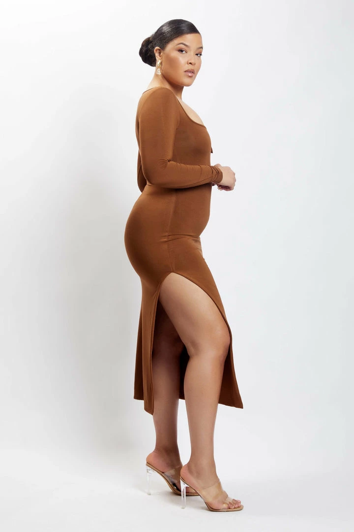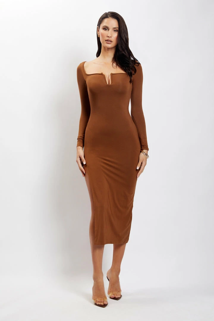 Born to stand out, the MYA Long Sleeve Midi Dress will turn heads with every wear. Crafted from a comfortable jersey fabrication, Mya is best dressed at every social gathering she attends. She is a form-fitting midi that contours to your figure and features a U-bar detailing to the neckline to show off your cleavage. Let her be the main attraction and style with minimal accessories.