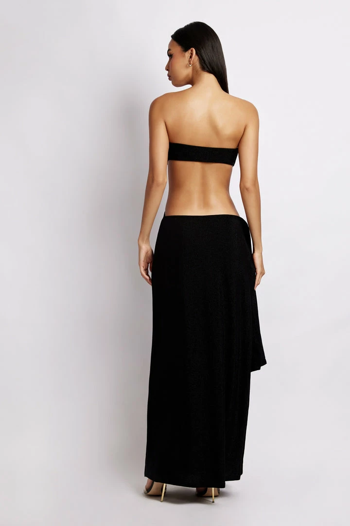Introducing SIERRA. Revamped from our much-loved Christina Backless Maxi Dress, Sierra showcases a striking strapless silhouette with waist cut outs, a centre front O-ring feature and statement thigh high split. Captivate at your next special event with her shimmer jersey fabrication that will have you looking and feeling flawless. Pair with barely-there stilettos and minimal accessories.