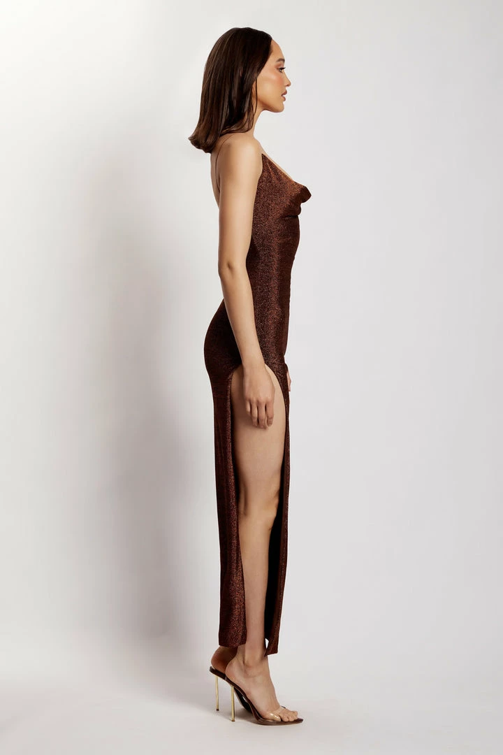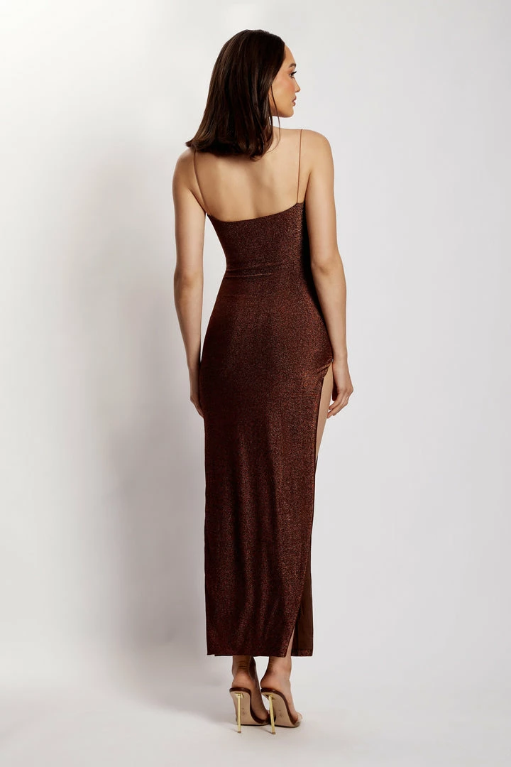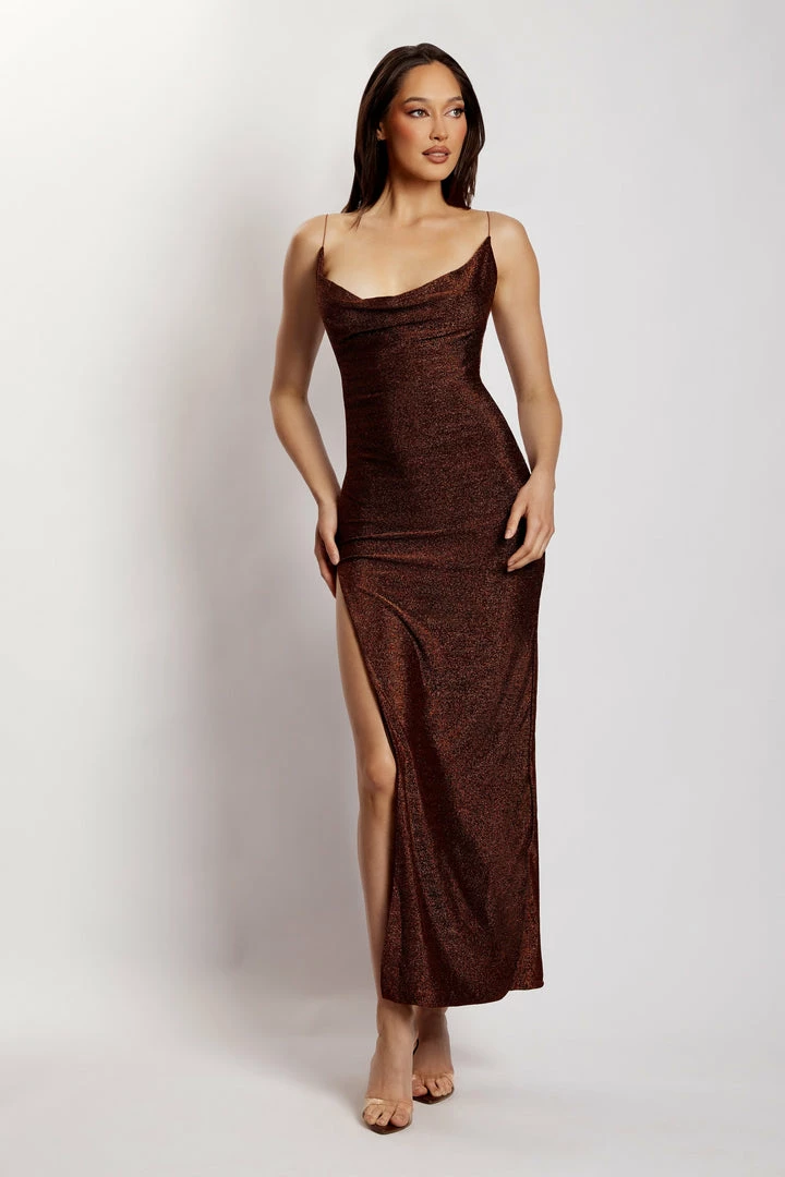 The TAMMY Shimmer Deep V Maxi Dress showcases a simplistic silhouette in a show-stopping shimmer jersey. Designed to contour to your body and accentuate your curves, Tammy features a cowl neckline and thigh-high split to enable movement with ease. Pair with acrylic heels and you’ll be the best dressed guest at your next event.