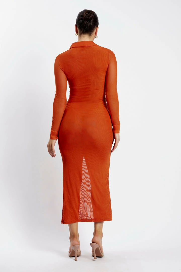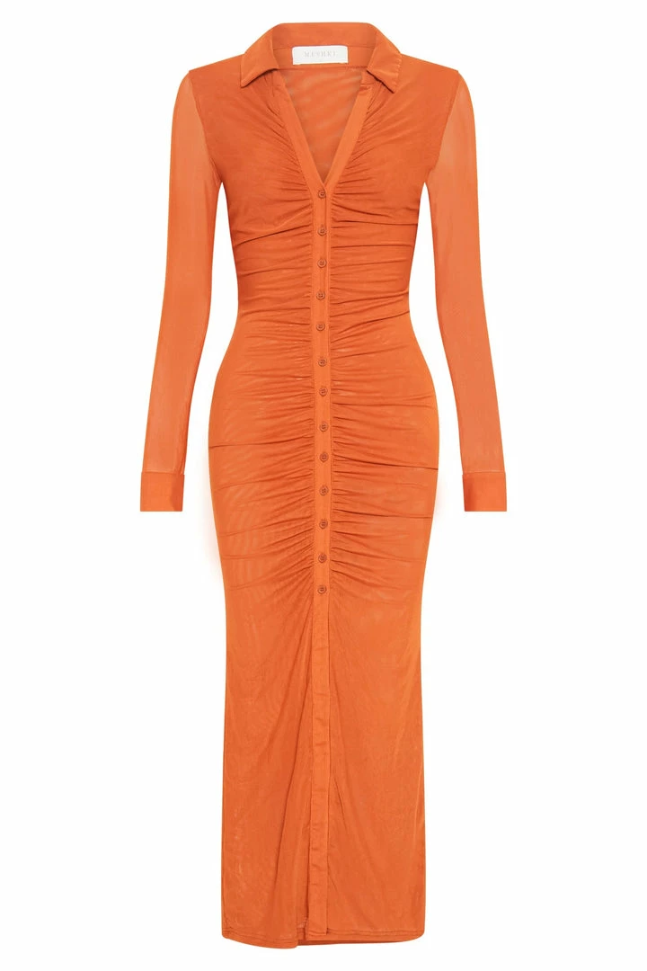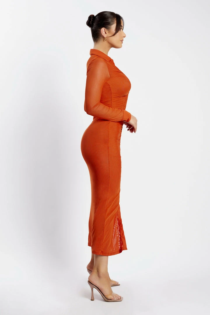 Meet JENNY. Embody luxe sophistication with our figure-enhancing, bodycon number for a season of celebrations. Bold yet effortlessly elevated, Jenny features a collared neckline, bodycon silhouette with centre front ruching and sheer full length sleeves. Take her to a long lunch or sunset soiree with a pair of strappy heels and gold jewellery.