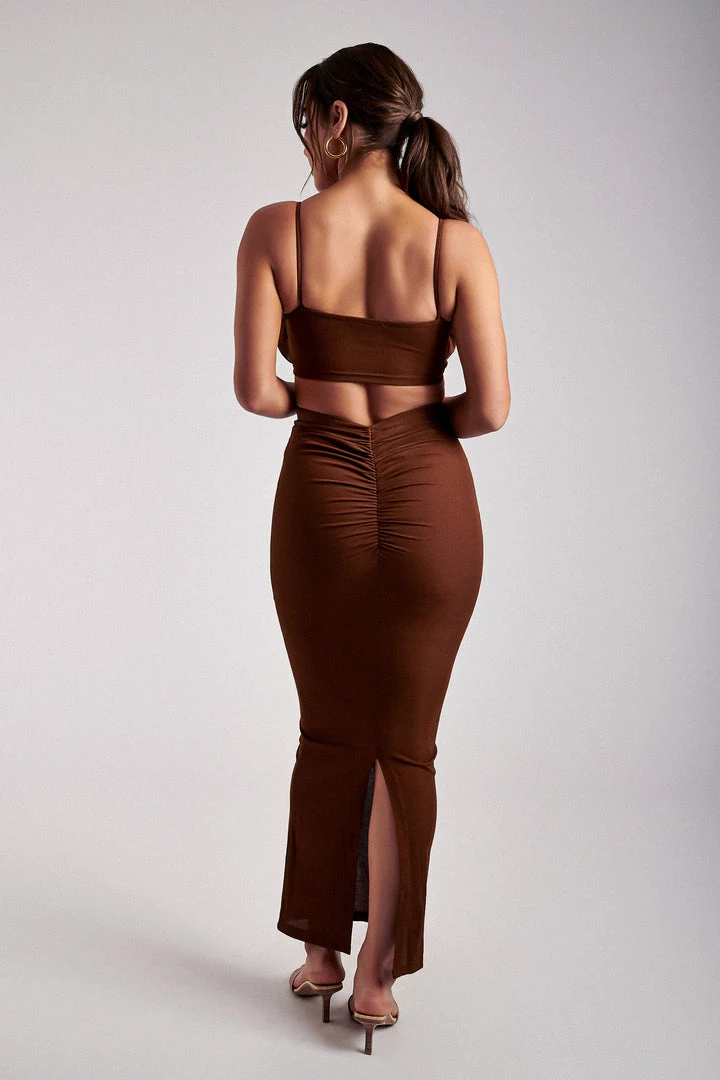 Stand out in our JORDAN Crop Top! This flirty top features round ruched cups made from a soft ribbed jersey, creating a luxurious finish. Pair with our ROXIE Maxi Skirt.