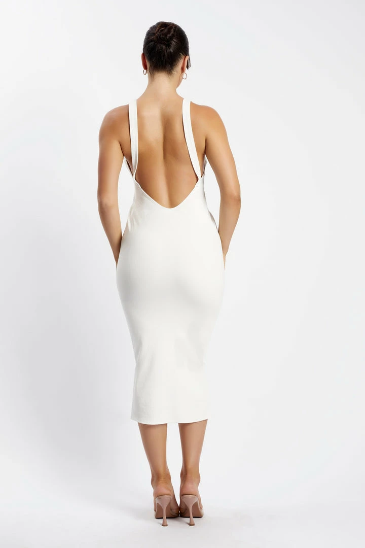Meet LEIGH. Flawless and sophisticated with a contemporary twist. Quick to become a wardrobe staple for the MESHKI girl, this bodycon midi features a striking open back and elongating silhouette. She is crafted from our much-loved CONTOUR Ribbed fabrication for a flattering fit and offers endless versatility. Pair with chic slides and statement sunnies for seaside al fresco dining or style with a sleek bun and barely-there stilettos for your next dinner date.