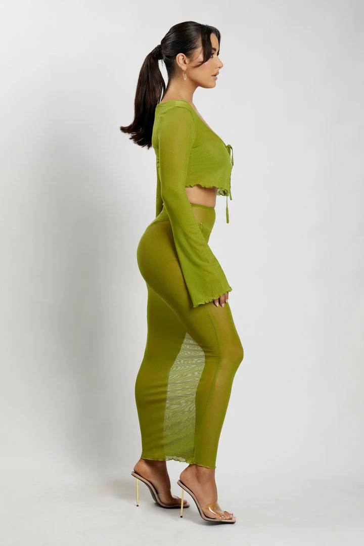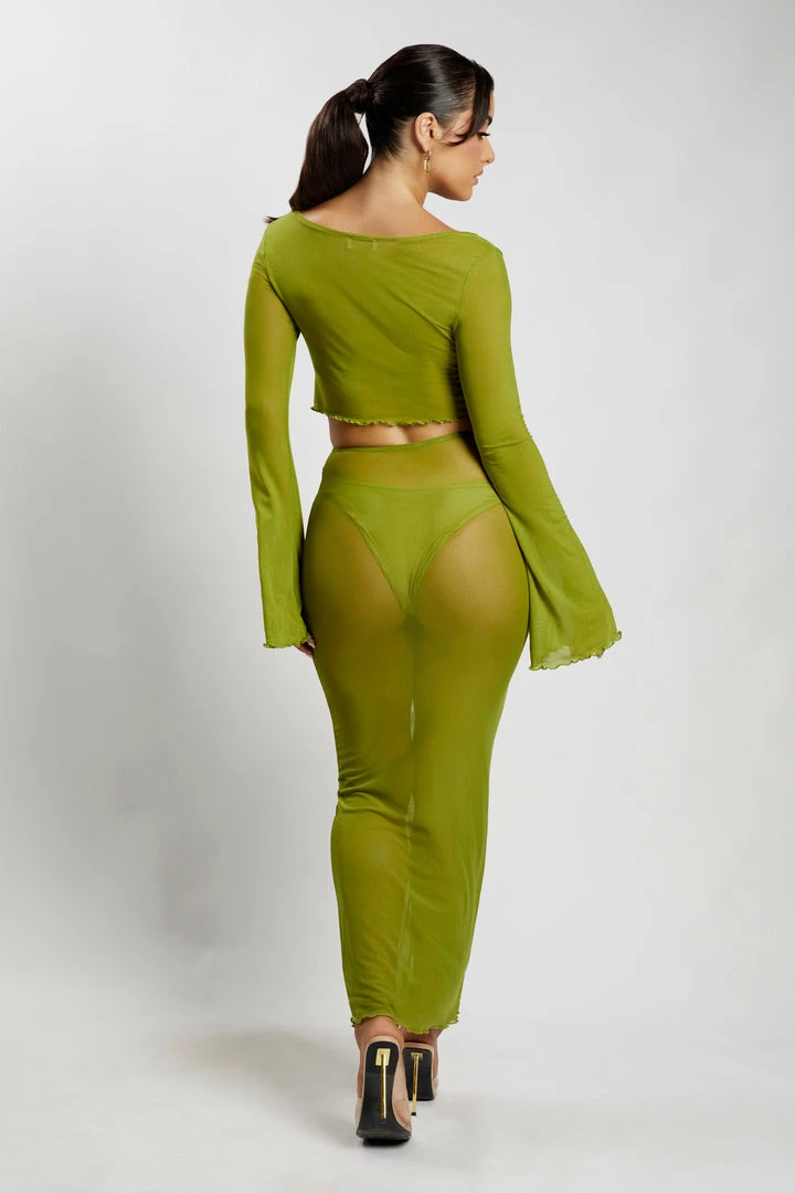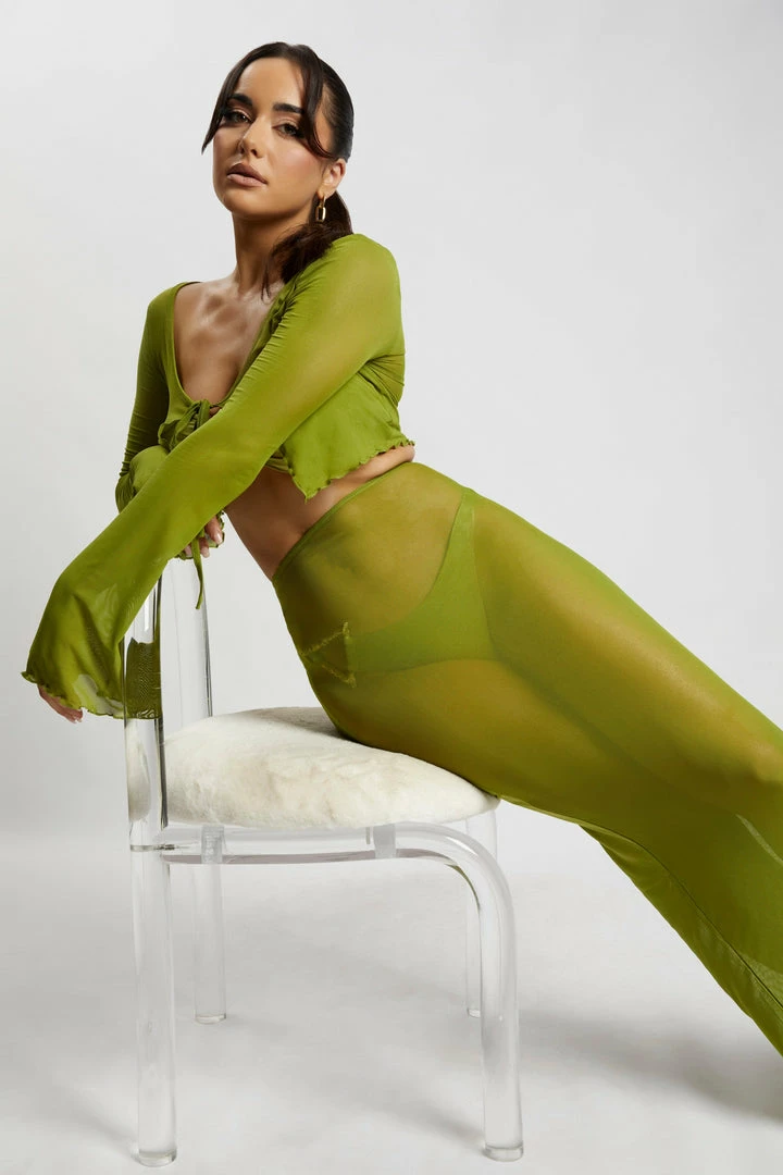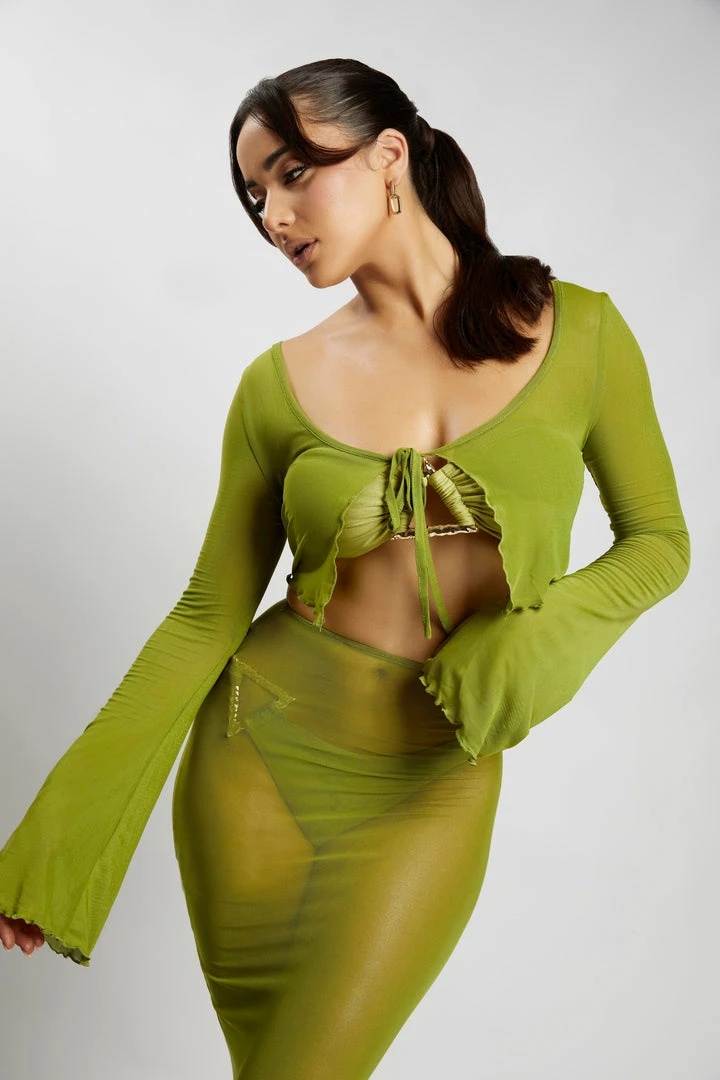 Exude modern femininity in the NATALIA Flare Sleeve Mesh Crop Top. Combining playful details with sheer mesh, Natalia will take you from beach to bar with ease. She features a wide scoop neckline with a self-tie closure – designed to effortlessly layer over your swimwear without compromising style. Complete with bell sleeves for a touch of drama, we’ve got you covered for this season and beyond. Style with MESHKI Swim and our matching Natalia Mesh Midi Skirt.