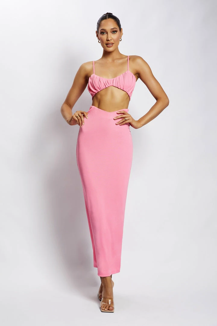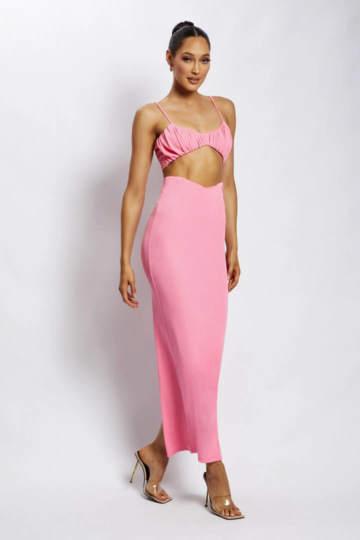 Say hello to ROXIE. This V Waistband Maxi Skirt celebrates the feminine form with her bodycon silhouette and back ruching that will enhance your booty and contour your curves. Designed in a knit jersey fabrication, Roxie is stretchy for comfort and features an elastic waistband for a seamless finish. Pair with our Jordan Ruched Front V Front Top for the dream duo.