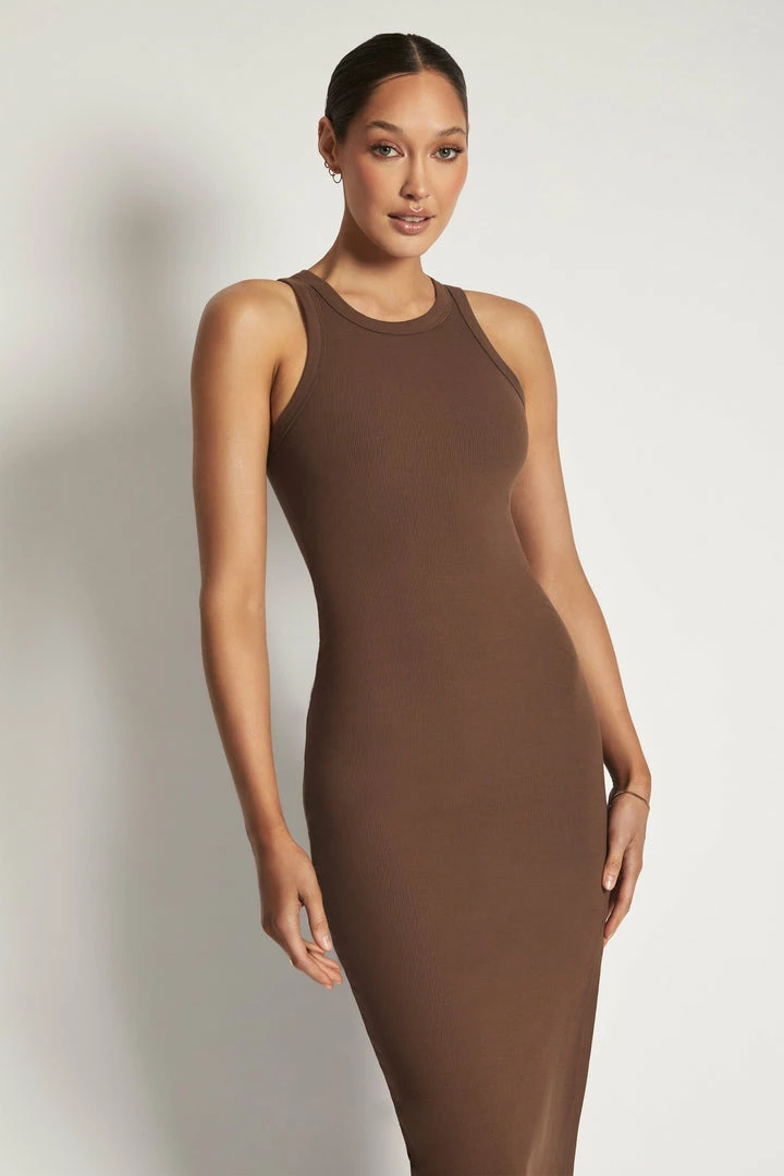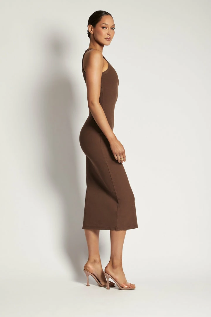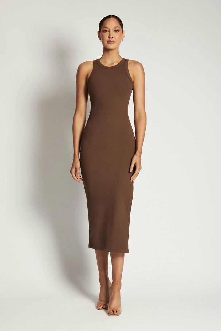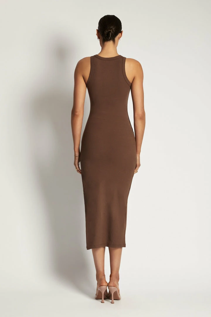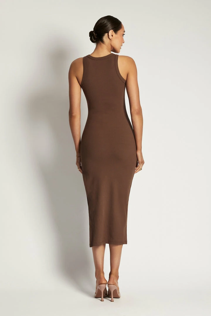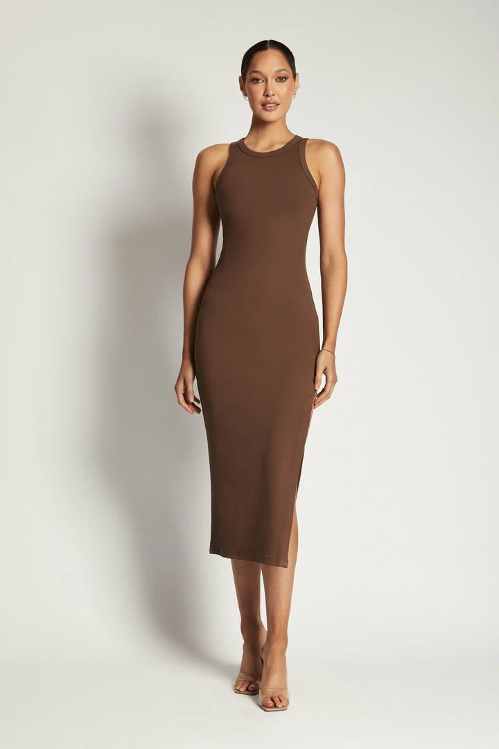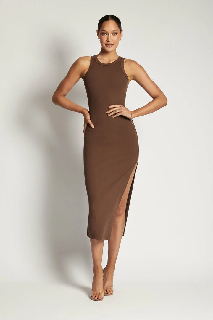We’ve recreated our best selling silhouette in our new custom CONTOUR Ribbed fabric that’s comfortable with a soft hand-touch, supportive with high stretch and retention quality and keeps your (undergarments) secrets safe with a high density fabrication. The racer, high round neck with a wide binding on the VIOLA Dress makes it flattering without revealing too much skin and the semi-high split on one leg adds a slight bit of drama while making it comfortable to walk in. It’s perfectly lengthen below the knee to be your most classy and reliable wardrobe staple..