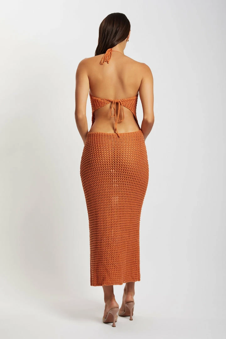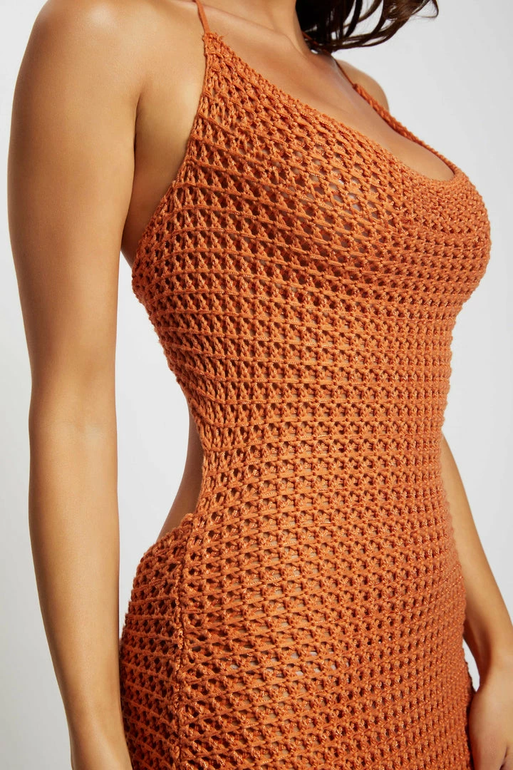 Simple statements are made easy in the DEBRA Cowl Neck Crochet Midi Dress. Translated through a contoured silhouette that skims your form, Debra offers barely-there halter straps and a striking open-back to showcase your summer glow. Style with neutral accessories for sunset drinks by the beach as you revel in the warm ocean breeze.