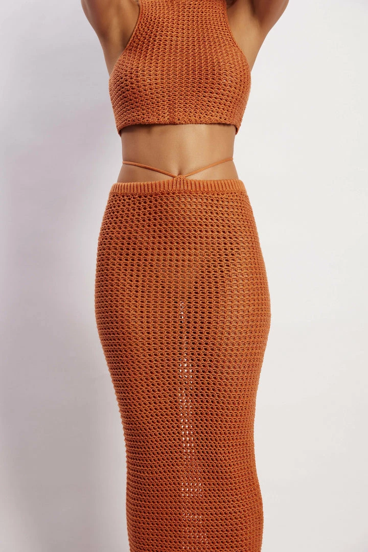 Equally chic and carefree, the RAQUEL Crochet Maxi Skirt is here to refresh your signature off-duty staples. Cut from a crochet knit, Raquel boasts a streamlined silhouette, ribbed waistband with self-tie features to contour your waistline and a full length design for sheer sophistication. From boat parties to sundown cocktails, she’s best paired with our Raquel Crochet Lace Up Back Top and statement accessories.
