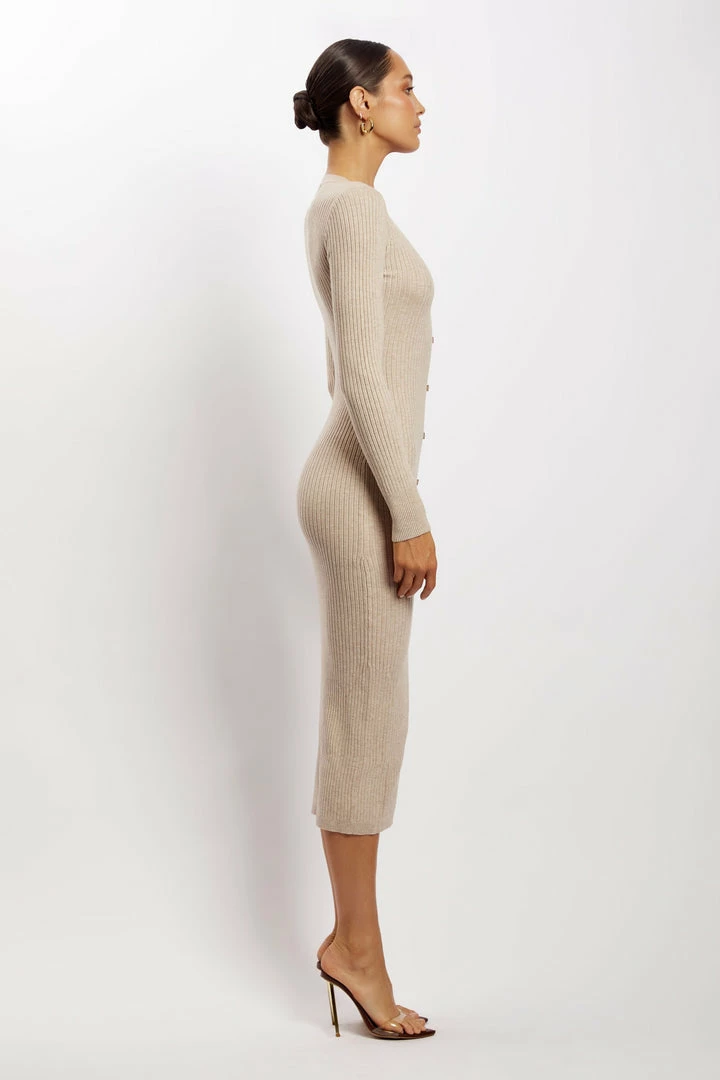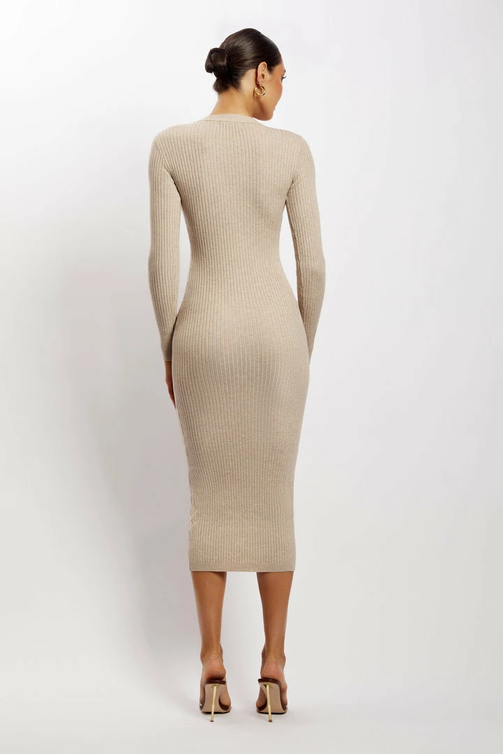 Meet your latest wardrobe must-have in an all new neutral hue. Designed for a chic and flattering fit, the BRYNN Long Sleeve Button Down Midi Dress is crafted from a luxurious ribbed knit fabrication that naturally contours to your body. She features a v neckline that compliments your collarbones, centre front button detailing and a front split to elongate your legs. Brynn will have you looking sophisticated from the office to dinner dates and everything in between.