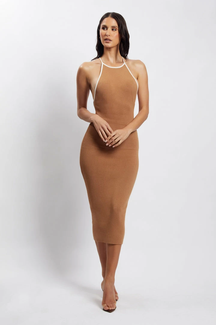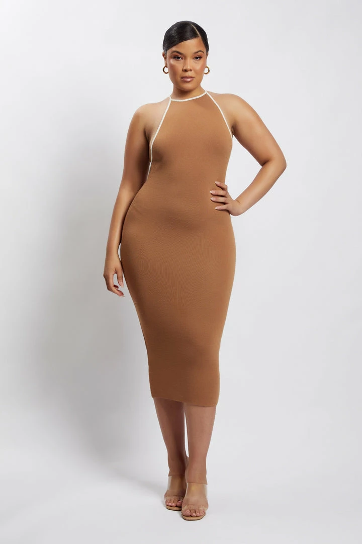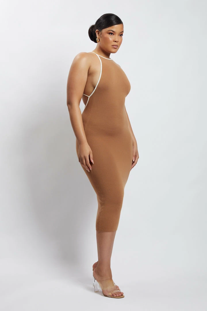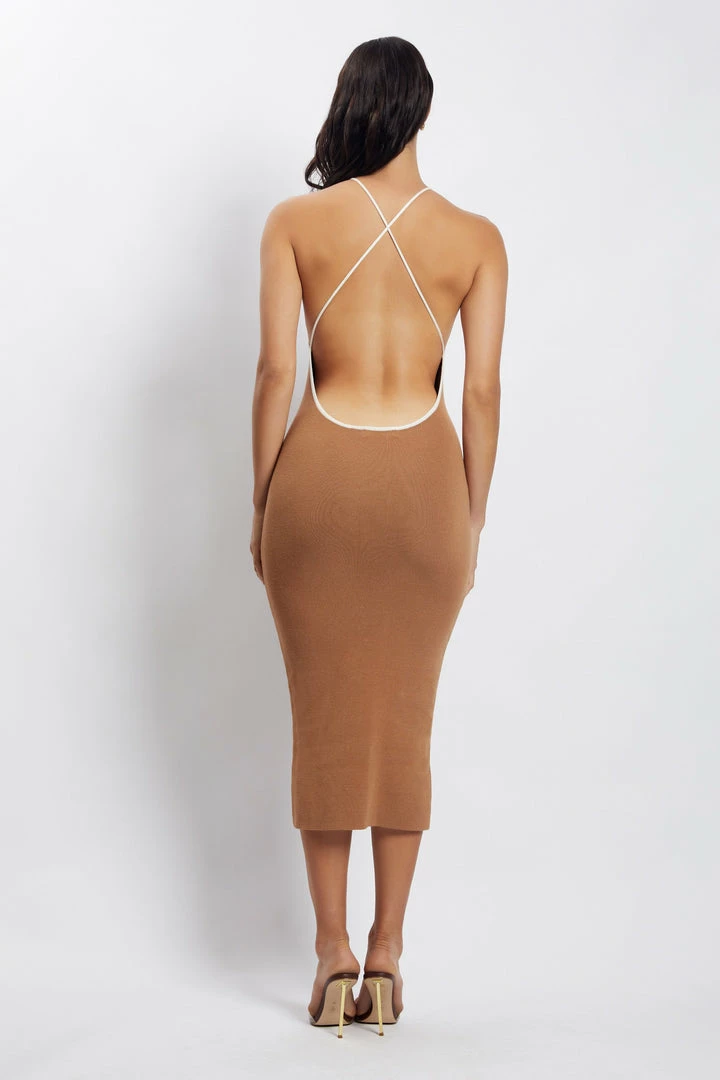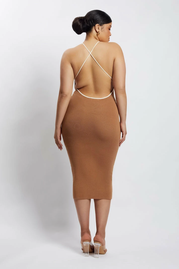 Business up front, party in the back. The HEIDI Contrast Binding Knitted Midi Dress is a wardrobe must have for the modern muse. Fitted in its form, Heidi is crafted from our signature ribbed knit fabrication that seamlessly contours to your curves and finishes at a midi length. Her modest neckline is juxtaposed with a striking open back with thin cross back straps. Complete the look with strappy heels and all eyes will be on you.