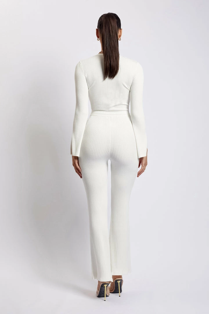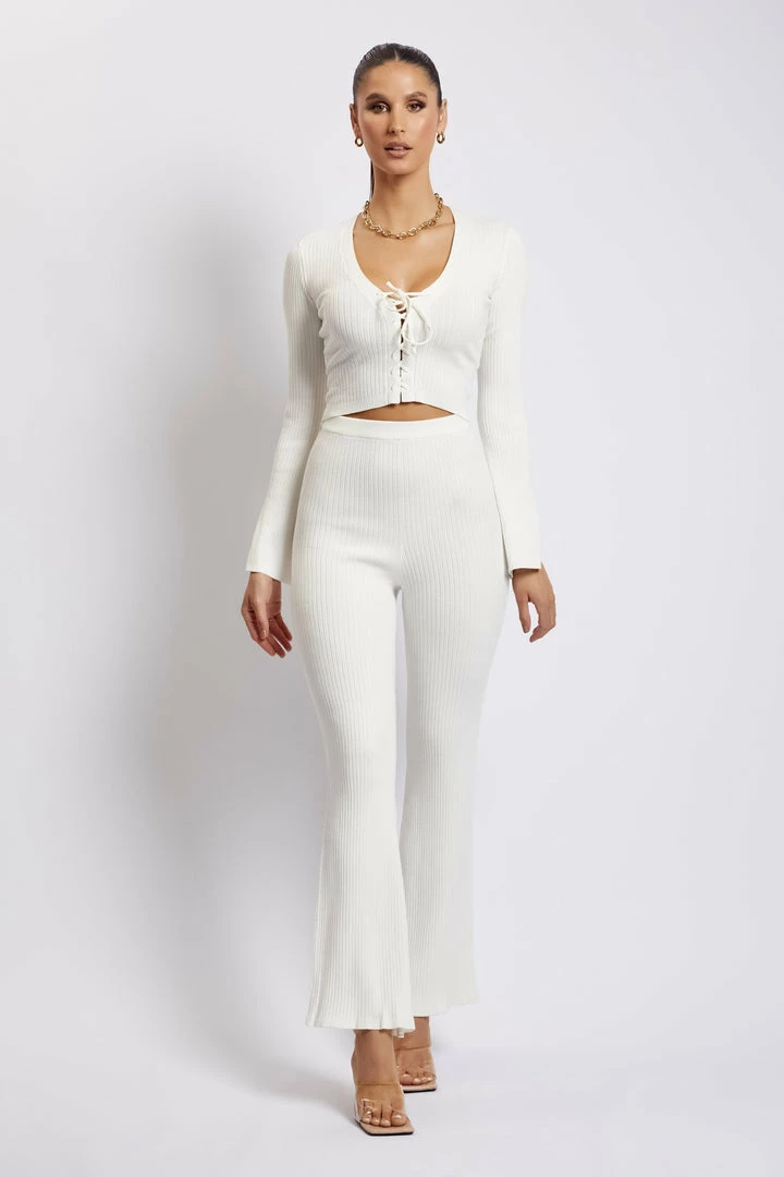 Elevate your staples with self-tie lace ups and split flare sleeves. The GEMIMA Lace Up Knit Crop Top is anything but basic and designed with understated simplicity for maximum versatility. She is cut from a form fitting ribbed knit to sit closely on the body and a cropped design to pair with all your high waisted bottoms. We’re completing the look with our Gemima Flare Knitted Pant and gold jewellery for the ultimate long lunch look.