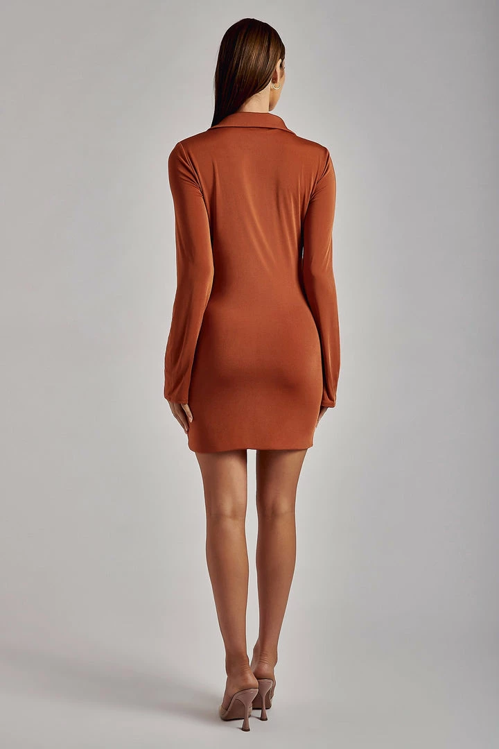 Feel luxurious in our ALEXANDRA Ruched Long Sleeve Mini Dress! This lightweight button-up bodycon mini will fit like a glove. Pair it with heels and a chic shoulder bag for a girls night out!