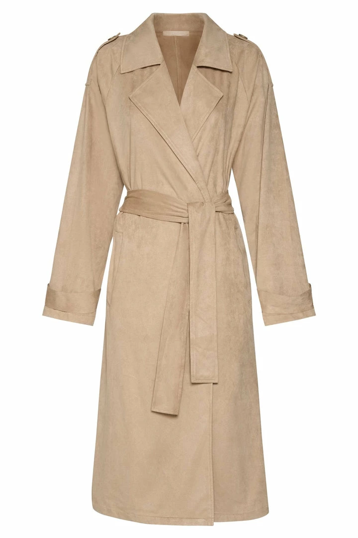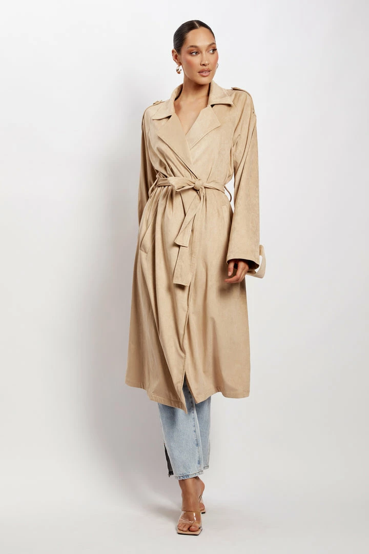 Elevate your outerwear game with the CAMILLA Suede Trench Coat. Equal parts timeless and sophisticated, Camilla boasts a classic longline silhouette with wide lapels, raglan sleeves with cuff features and epaulettes. Team with our MESHKI Basics and oversized denim for a look through street style lens or layer over a crop and dressy pants for a night on the town.
