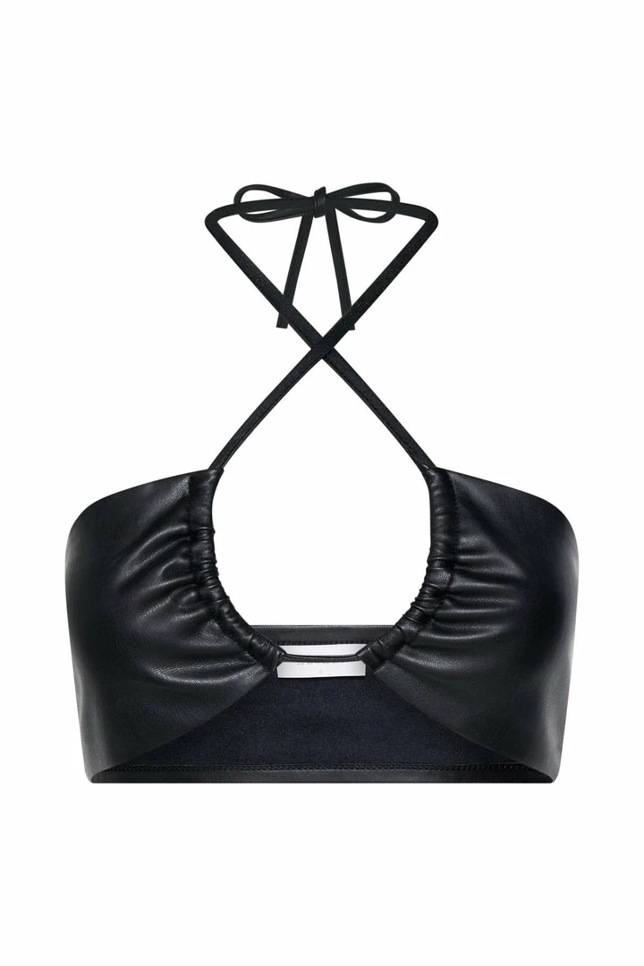 Our ongoing love for faux leather has been refreshed in the RUBY Faux Leather Ruched Crop Top. Suspended by skinny halter straps, Ruby redefines ‘less is more’. For an effortless edge to your ensemble, team with MESHKI Denim or our co-ordinating Kamora Faux Leather Wide Leg Pants and strappy heels.