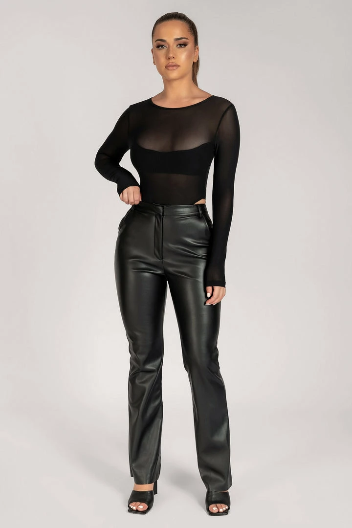Our TYRA pants are here for making moves and stealing hearts. These pants are crafted from a soft PU leather fabric and feature a tailored high waist and straight leg fit that will flatter your legs. Finished with a lapped zipper and a hidden button at the waist, these pants snatch you in and hug your hips. Finally, the raw hem adds that edgy detail that will update your whole look. These pants are essential for your closet for creating effortless looks from day to night.