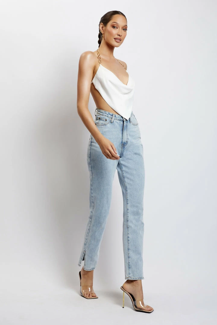 We’re opting for ultra glam this season. Think luxe and lustre… all night long. Crafted from a luxurious crinkle satin fabrication, the BRIANNA Cowl Gold Chain Top is the show-stopping crop you need for your event wardrobe. She features a classic cowl neckline, gold-toned chain straps to take your look to new heights and a striking open back with a skinny self-tie fastening. Team with MESHKI Denim for a head-turning ensemble.