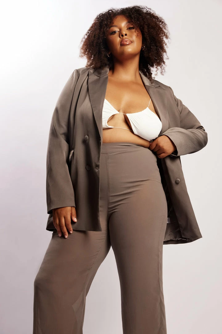 Redefine signature suiting in ELVINA. Blending comfort with sophistication, Elvina boasts a relaxed fit, double breasted design and functional hip pockets. Crafted from a luxurious satin fabrication, she has been designed to maximise wearability with her countless outfitting options. Complete the look with our Mary Knit Bralette and Amelia Sheer Pants for a polished ensemble.