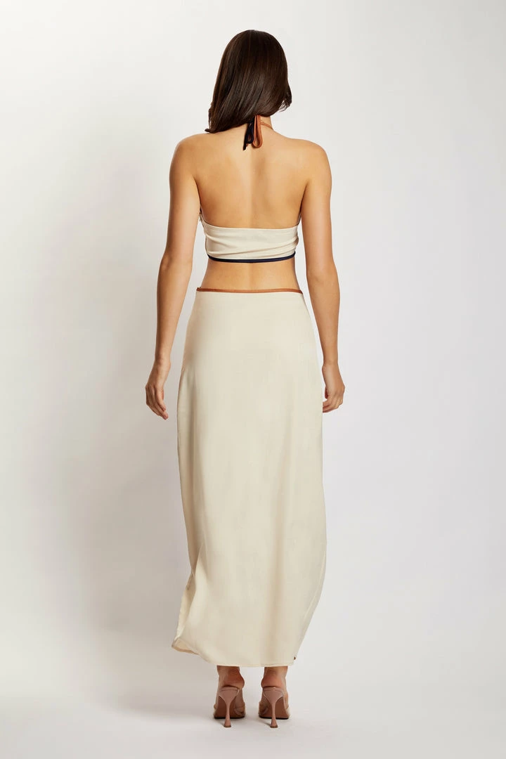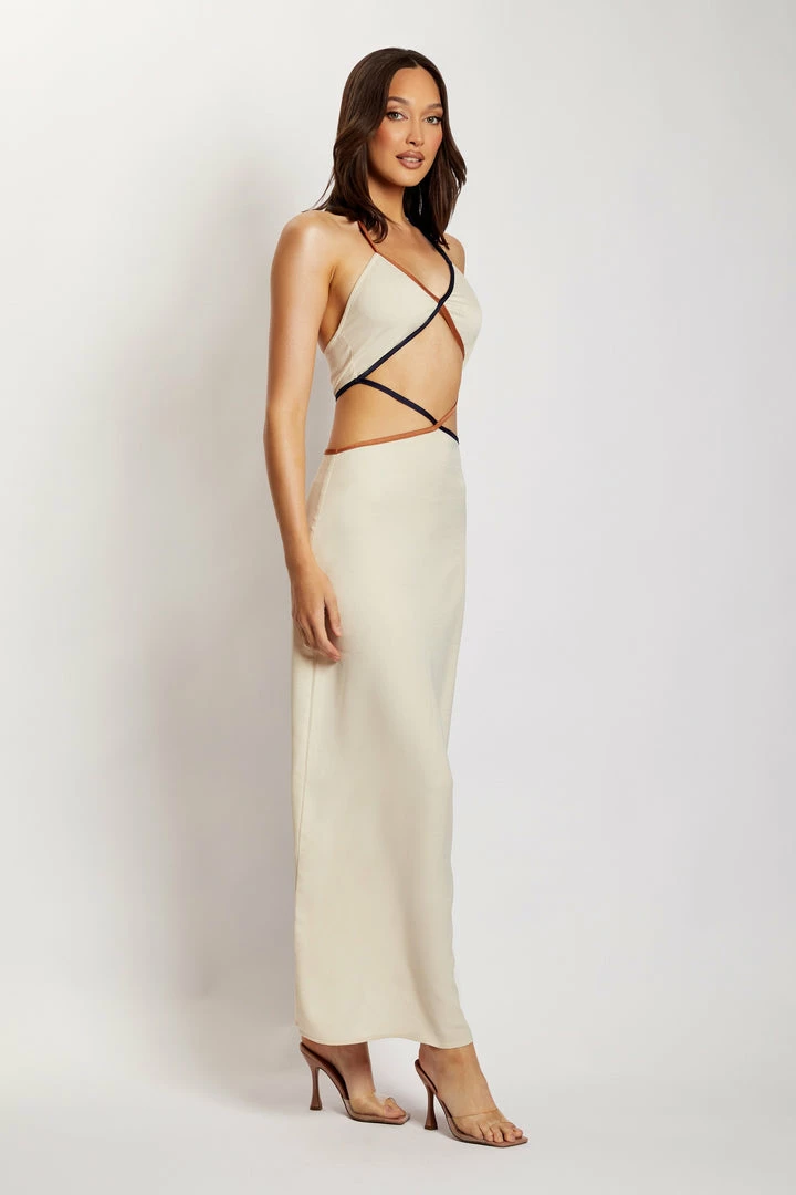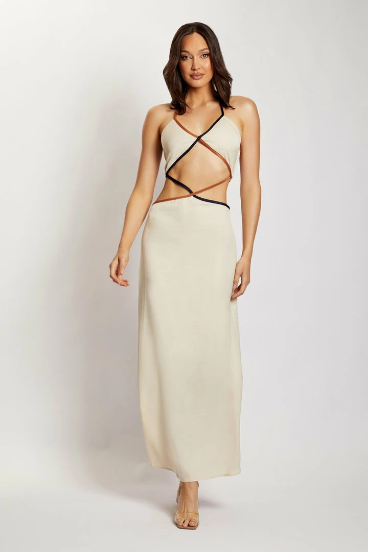 Turn heads in the GEMMA Satin Contrast Binding Cut Out Dress. Cut from a lustrous satin, Gemma showcases a unique design with its contrasting strap and binding details and cut-outs to front, waist and back for the ultimate flattery. We’re taking her to champagne with the girls or our next vacay.