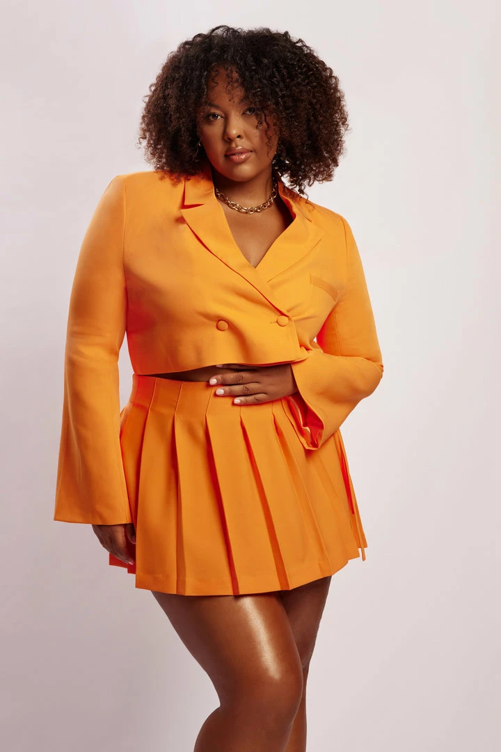 Introducing HALLE. A wardrobe must-have for the modern woman, Halle showcases wide pleats throughout with a side self-tie feature. Designed to bring structure to your ensemble, she is crafted from our trusted crepe fabrication in a mini A line silhouette. Opt for a casual yet compelling look with our matching Luella Flared Cropped Blazer and statement accessories.
