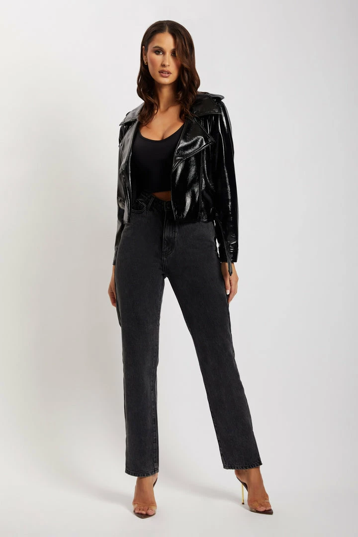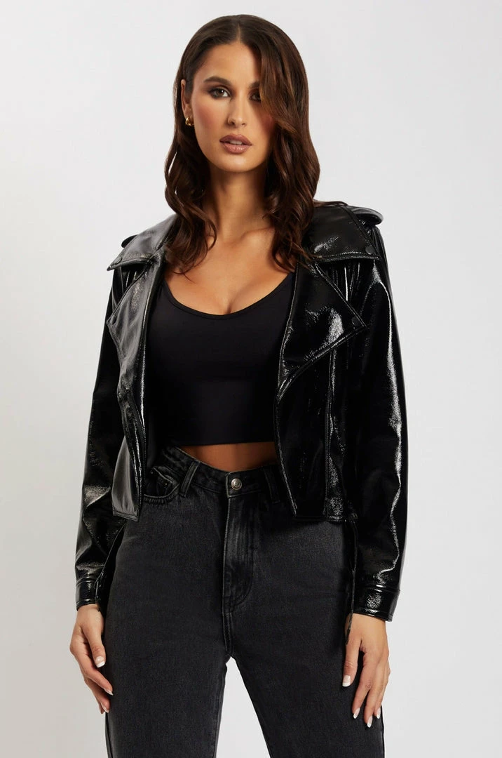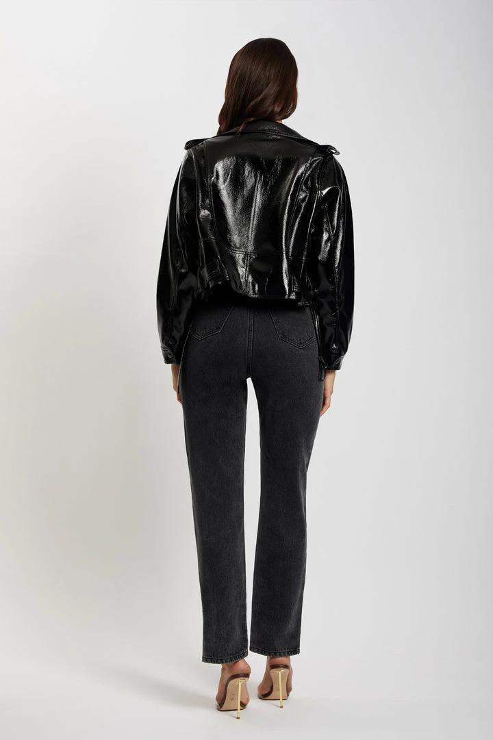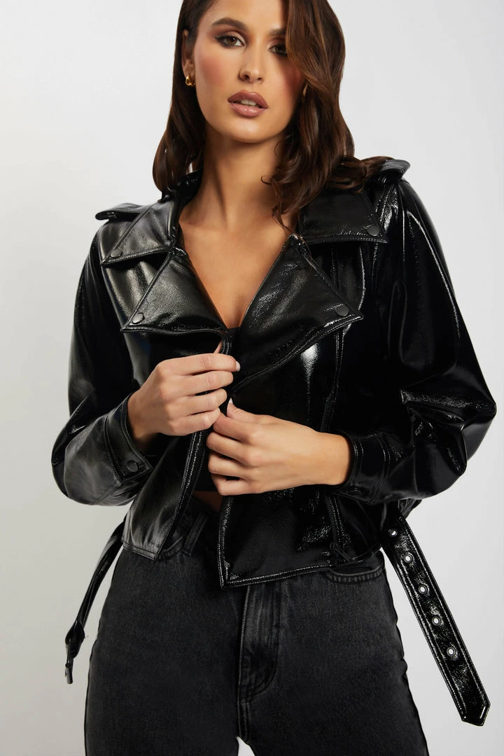 Elevate your next fit with our detailed ISOBEL Patent Biker Jacket. Featuring a wide collar, seam detail and belt you will always be stepping out in style. The perfect statement piece that every wardrobe needs. We recommend pairing with your favourite MESHKI Denim or be bold and pair with the OAKLEIGH Pant for a complete patent ‘fit.