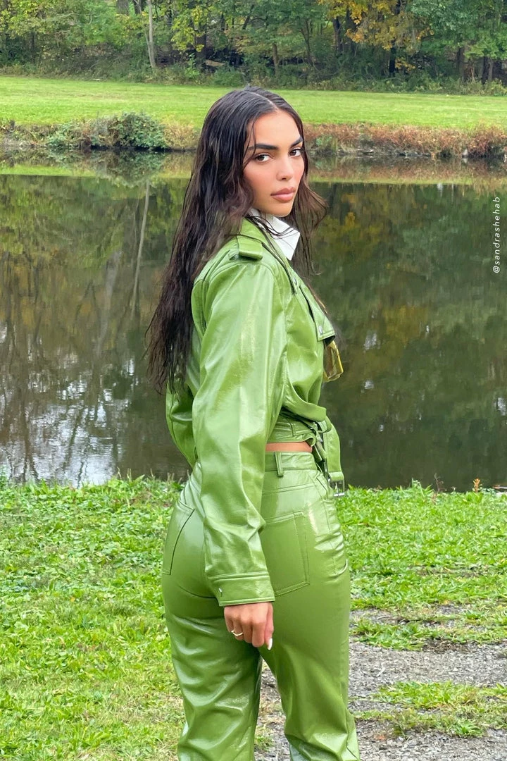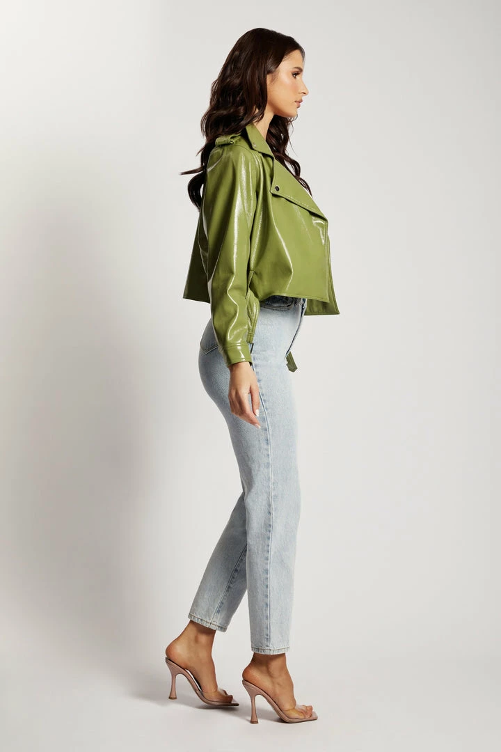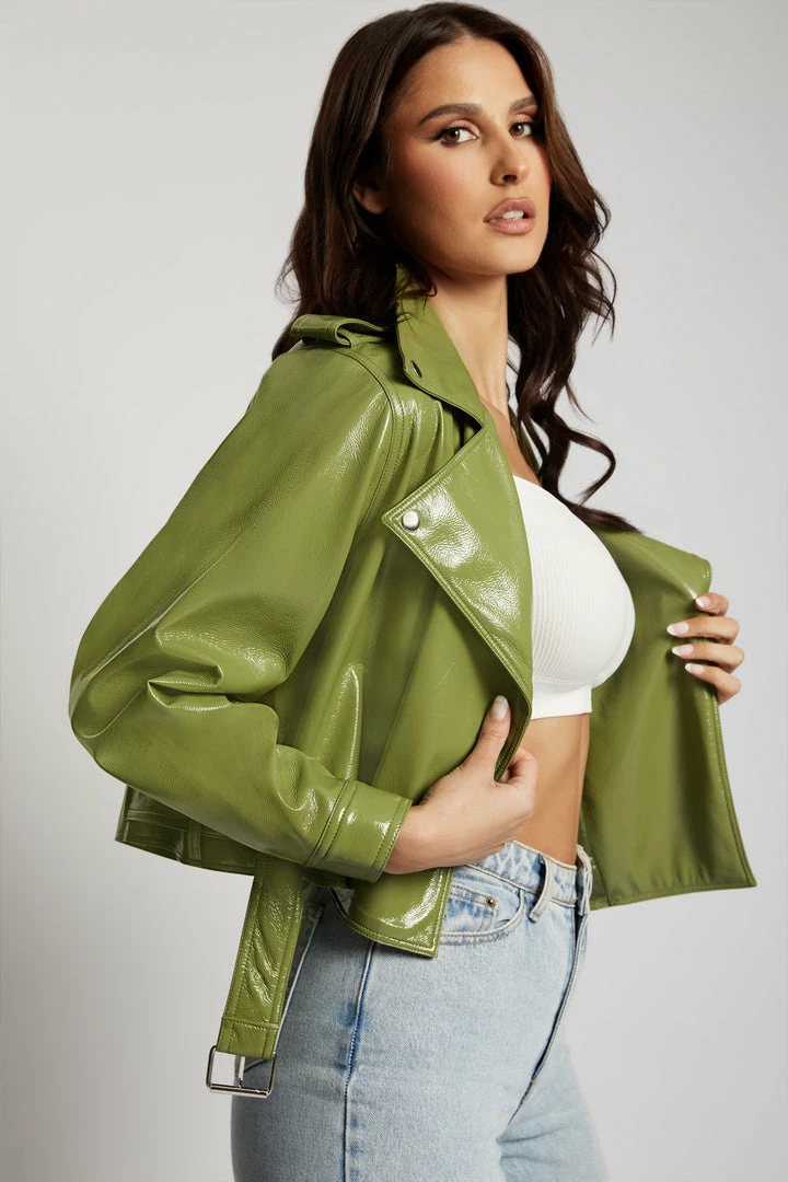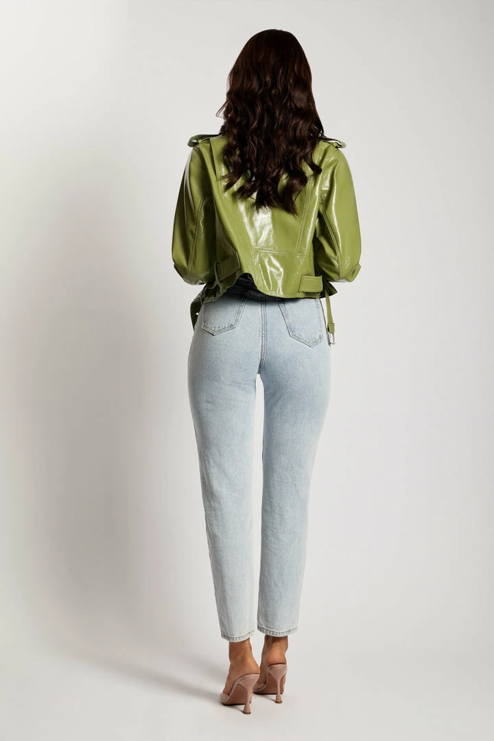 Elevate your next fit with our detailed ISOBEL Patent Biker Jacket. Featuring a wide collar, seam detail and belt you will always be stepping out in style. The perfect statement piece that every wardrobe needs. We recommend pairing with your favourite MESHKI Denim or be bold and pair with the OAKLEIGH Pant for a complete patent ‘fit.
