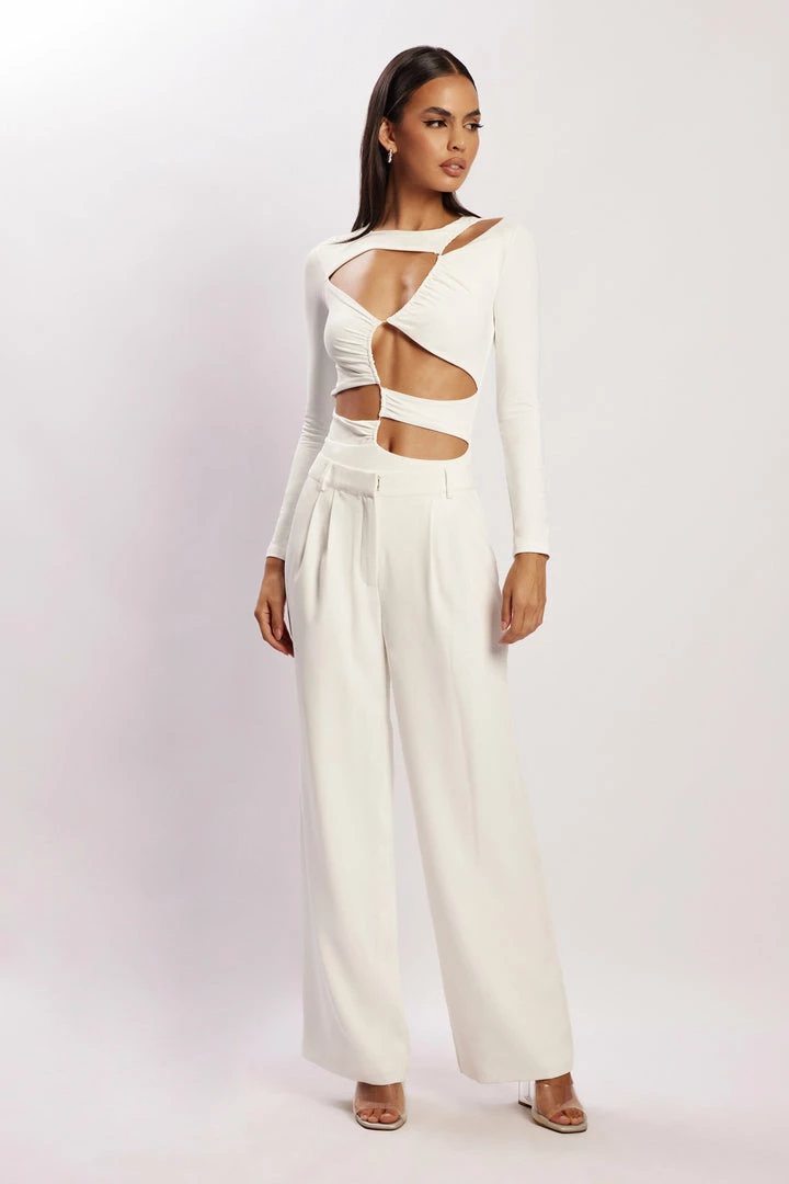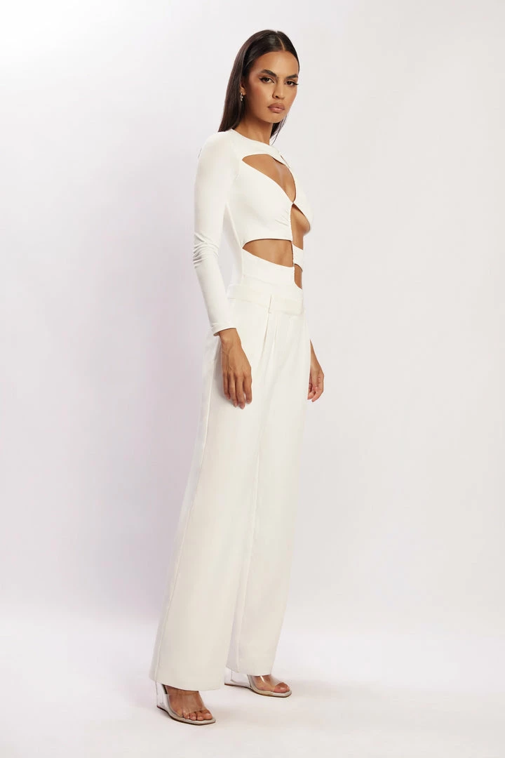 Complete your capsule wardrobe with JANELLE. Brought to life with a focus on versatility, Janelle combines comfort with a sense of ease. She is crafted from our trusted crepe fabrication and boasts a mid-rise fit in a relaxed yet polished silhouette. Style with MESHKI Basics to elevate your everyday or our Sahara Cut Out Bodysuit for the ultimate after-dark attire.