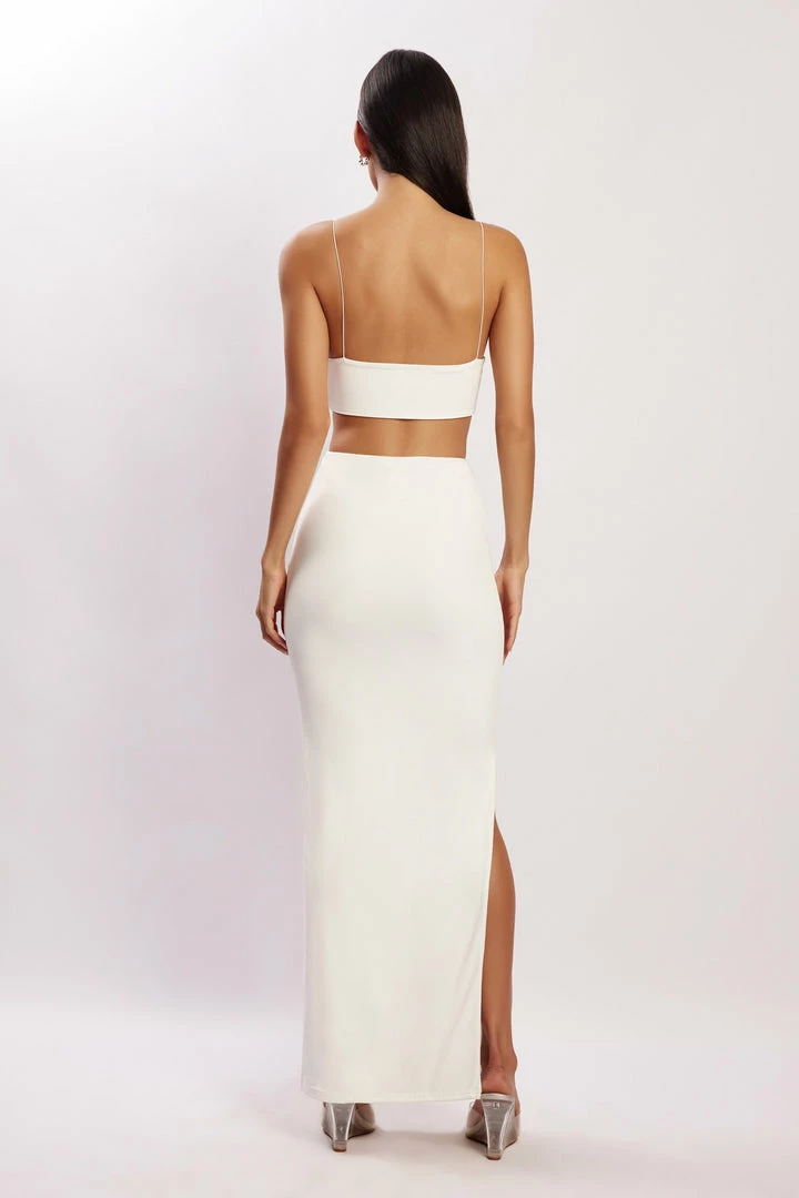 Crafted from a stretch jersey fabrication, MONTANA has been designed to turn heads with her intricate play on cut out and ruching. She celebrates the feminine form with her precisely placed straps that can be worn over the shoulders or across the chest and is cropped in design to pair with your favourite high waisted bottoms. We recommend styling with our Lottie Back Split Midaxi Skirt for a modern approach to coordinate dressing.